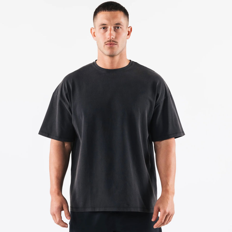 เสื้อยืดออกกำลังกายแขนสั้นทรงโอเวอร์ไซส์สำหรับผู้ชาย ผลิตตามสั่ง เป็นมิตรต่อสิ่งแวดล้อม เนื้อผ้าหนา โพลีเอสเตอร์/คอตตอน มองเห็นได้ชัดเจน พร้อมโลโก้ด้านหน้า ความยาวพิเศษ