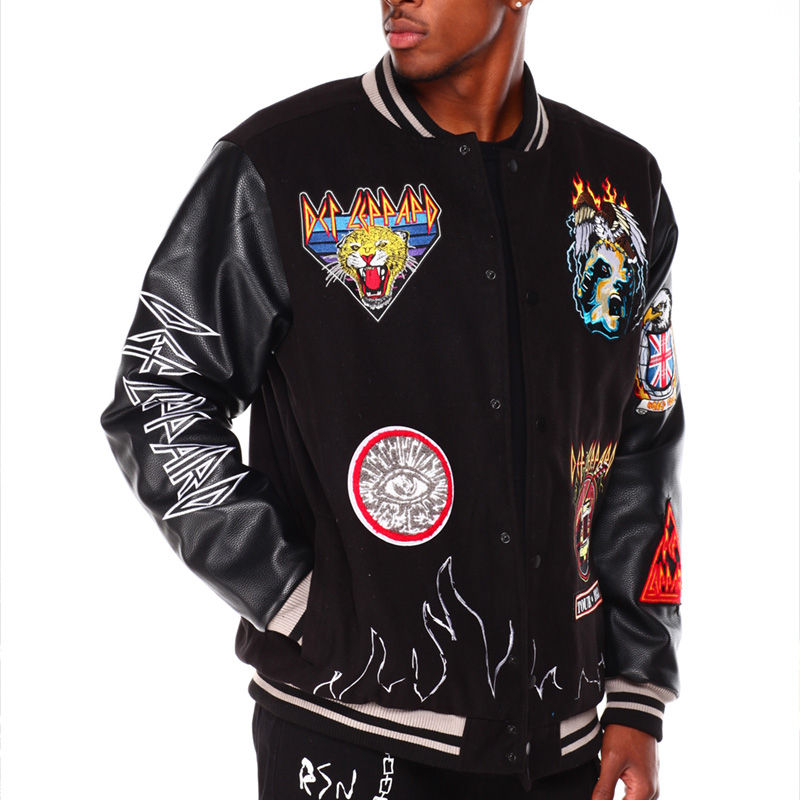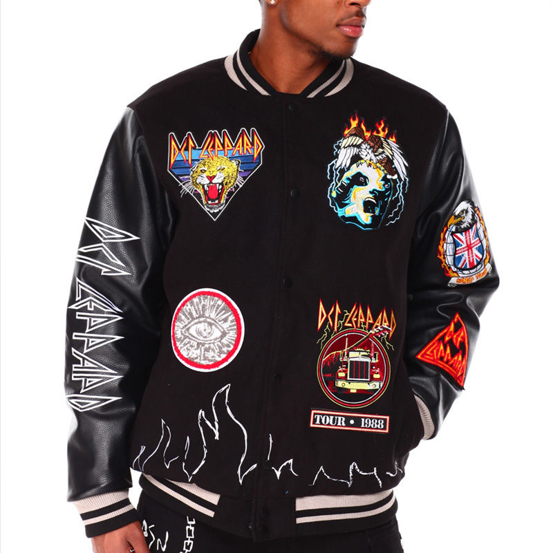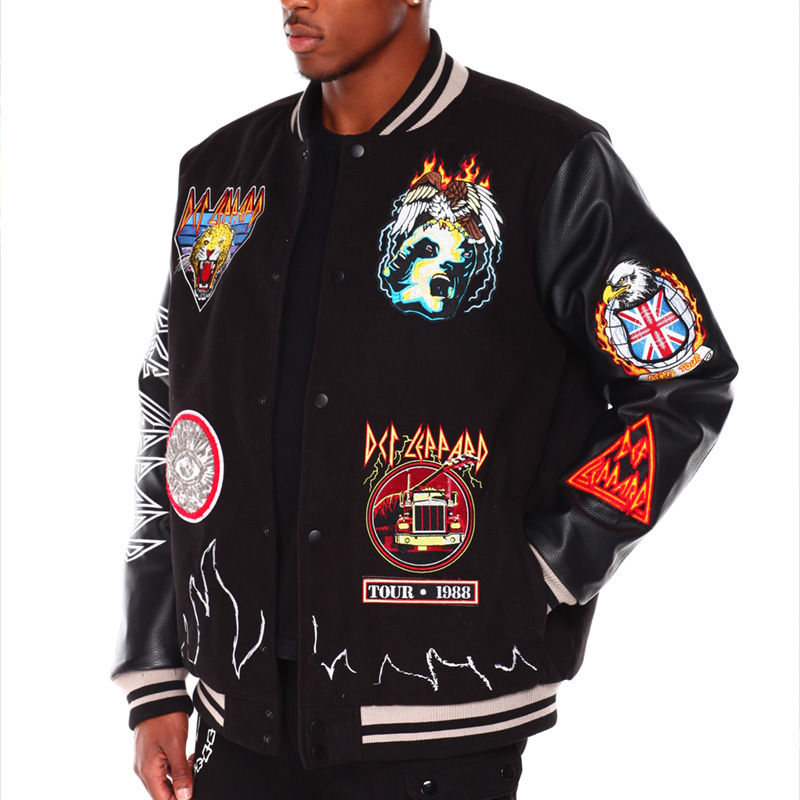 เสื้อแจ็กเก็ตบอมเบอร์ปักโลโก้ออกแบบได้ตามต้องการสำหรับผู้ชายฤดูหนาวมีปกหนังคอตั้งและลายผ้าปะติดมหาวิทยาลัย