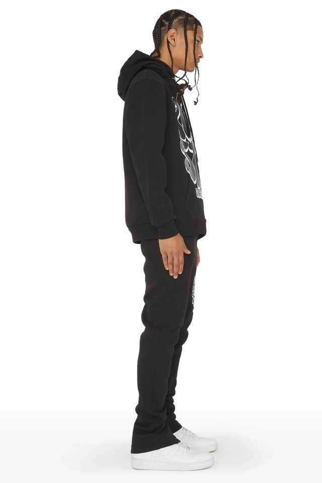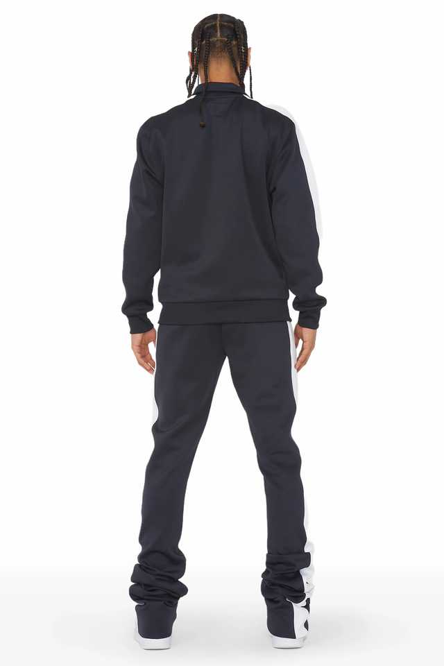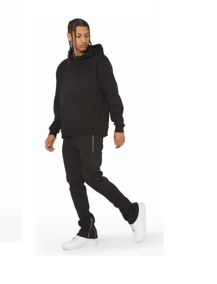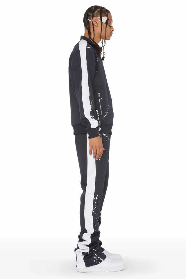 ชุดวอร์มสองชิ้นสำหรับผู้ชายชุดวอร์มกางเกงแบบเรียงซ้อนสีดำมีแถบสีขาวไซส์ใหญ่พิเศษออกแบบได้ตามต้องการ