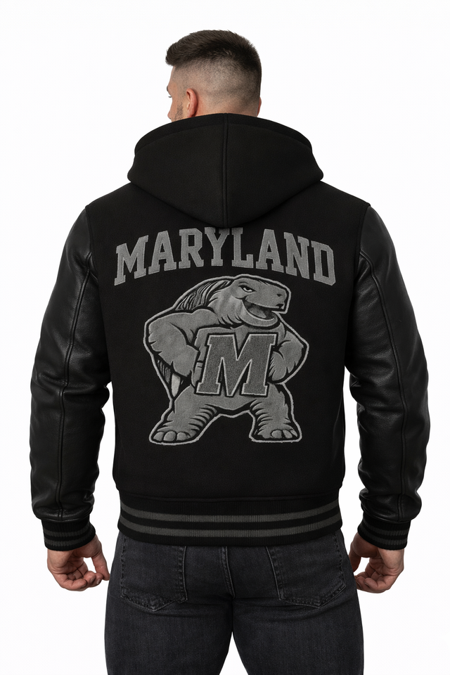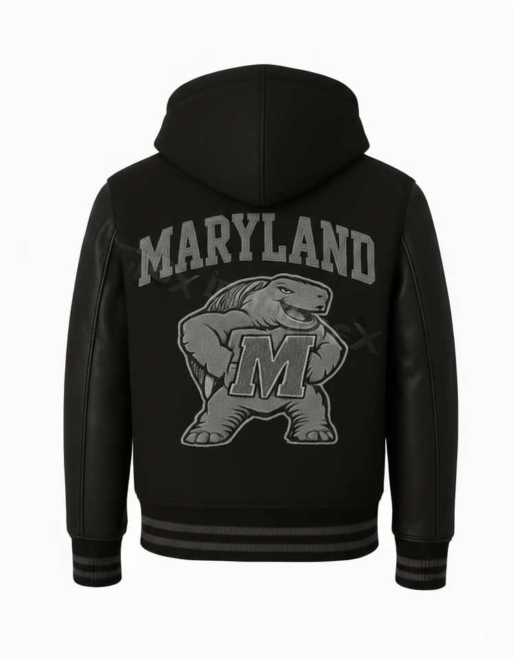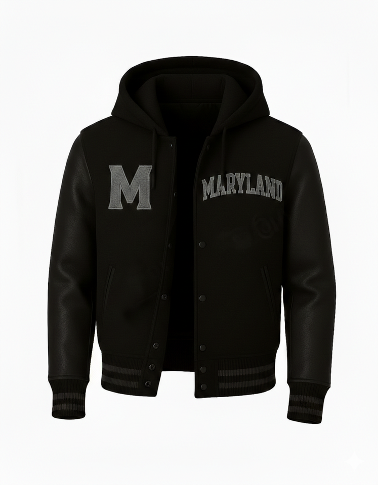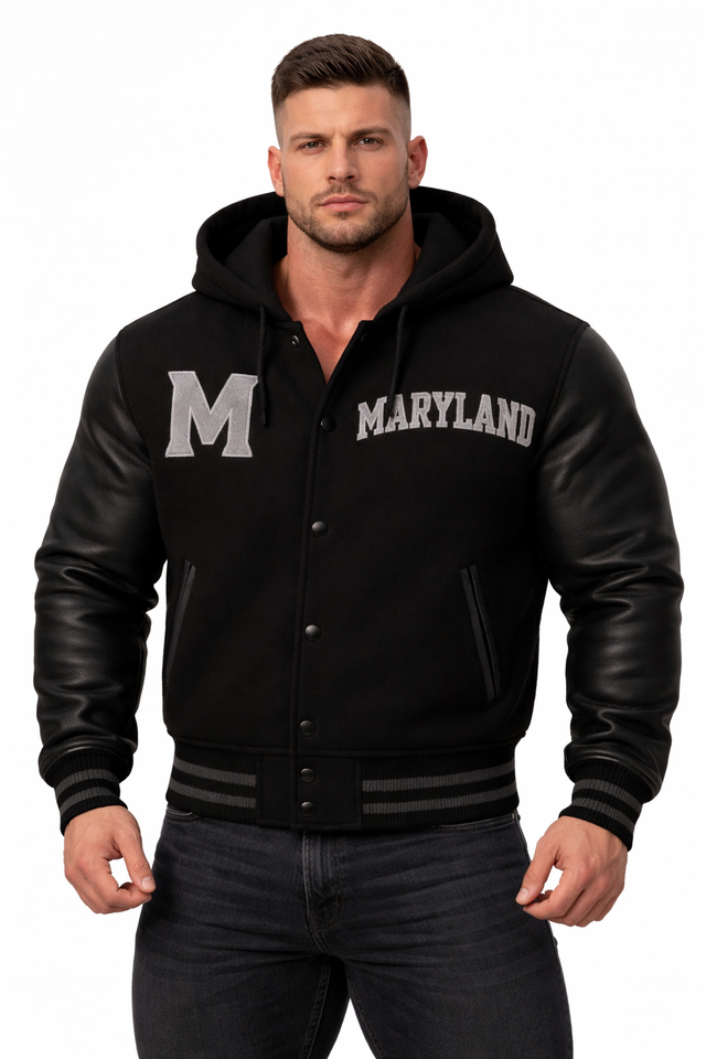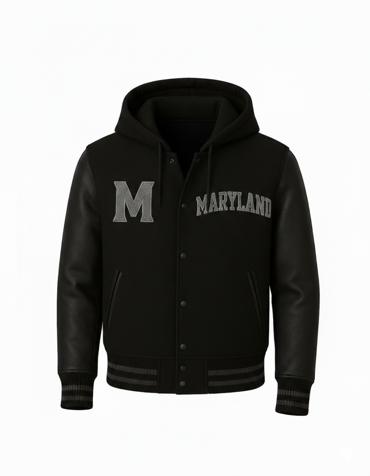 เสื้อแจ็คเก็ตเบสบอลแบบมีฮู้ดสำหรับผู้ชาย สไตล์วาร์ซิตี้ ตัดเย็บตามสั่ง พร้อมโลโก้ด้านหน้าแบบตัวอักษร Maryland สีดำ ทำจากผ้าขนสัตว์ กันน้ำ ระบายอากาศได้ดี เหมาะสำหรับสวมใส่ลำลอง