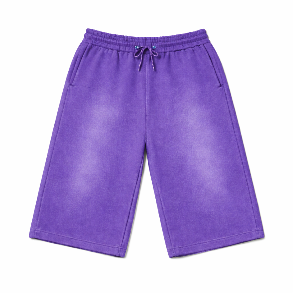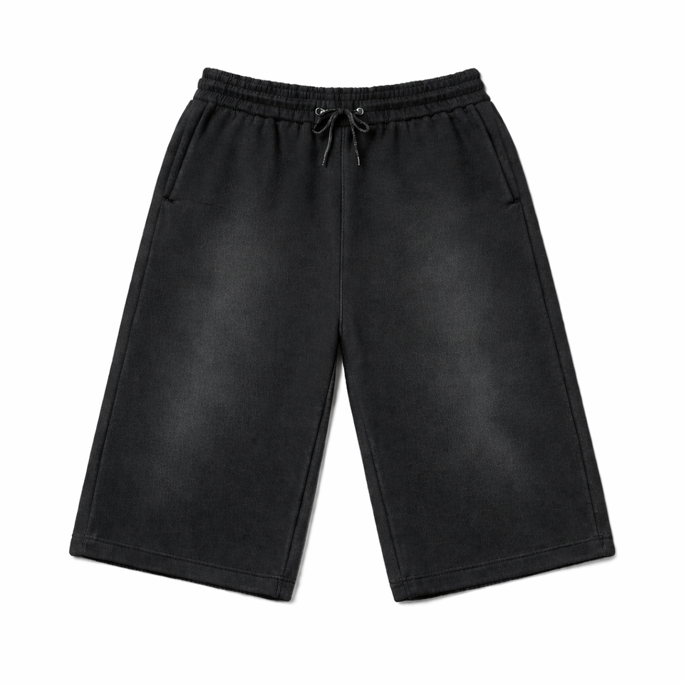 กางเกงขาสั้นผ้าฝ้ายหนาน้ำหนักมากสำหรับผู้ชาย แบบมีเชือกผูก ยาวถึงเข่า ล้างสีแบบแอซิดวอช เอวสองชั้น ทรงยูนิเซ็กซ์