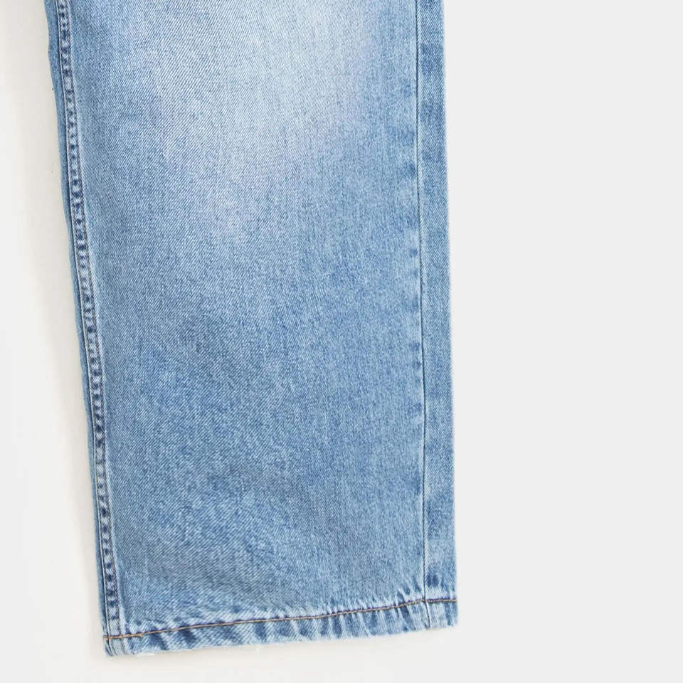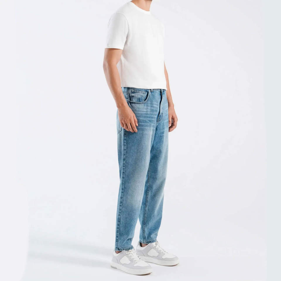 กางเกงยีนส์เดนิมสีฟ้าอ่อนฟอกสีแบบแอซิดวอช สไตล์ทรงตรง แต่งขาด ลวดลายโลโก้สั่งทำสำหรับผู้ชาย ไซส์พลัส ขายส่ง สำหรับฤดูหนาว ฤดูใบไม้ร่วง ฤดูร้อน