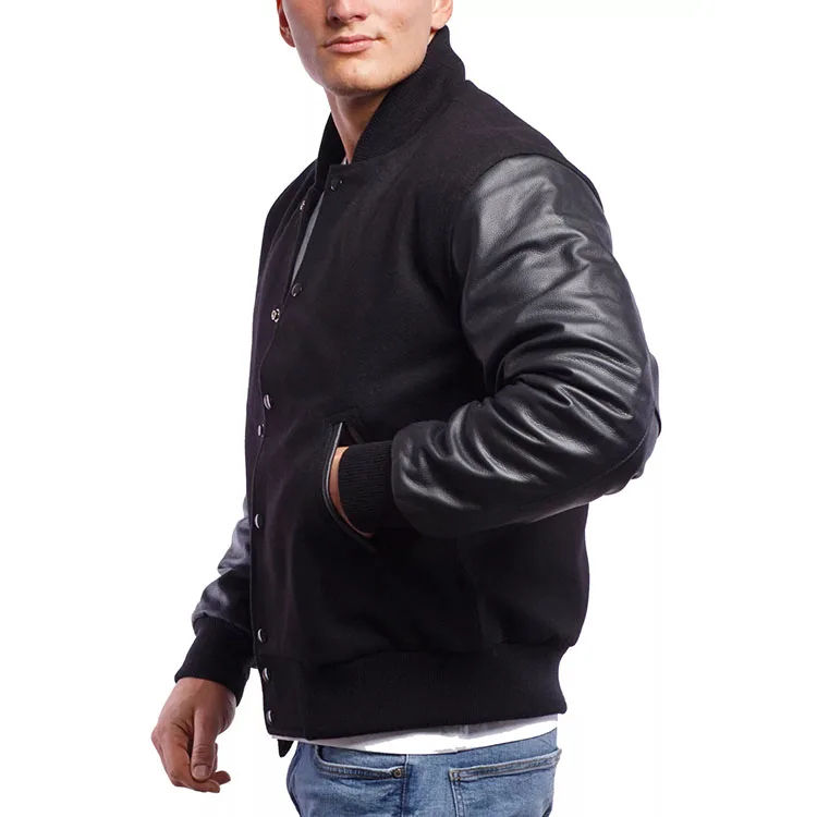 เสื้อแจ็คเก็ตเบสบอลวิทยาลัยแบบกำหนดเองสำหรับผู้ชาย แขนหนัง ปักลายบนผ้าแคนวาส คอตั้ง ปักโลโก้ด้านหน้า สำหรับนักกีฬา Letterman