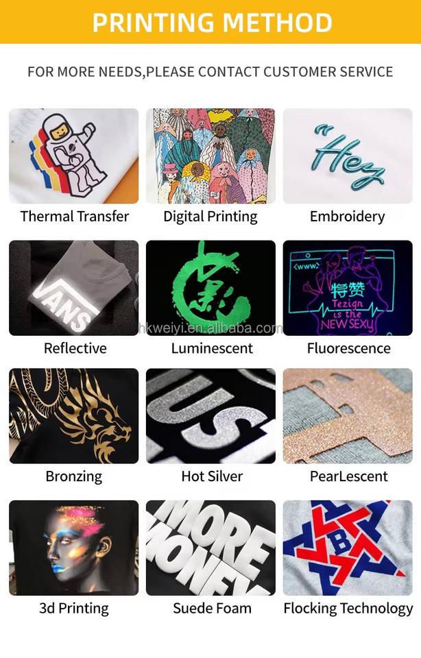 วิธีการพิมพ์:พิมพ์ออกมา, พิมพ์พัฟ, ลายนูน, การพิมพ์แบบถ่ายโอนความร้อน, การพิมพ์สกรีนผ้าไหม, อื่นๆ