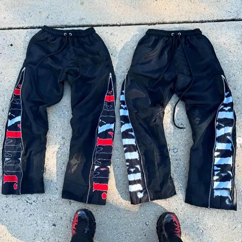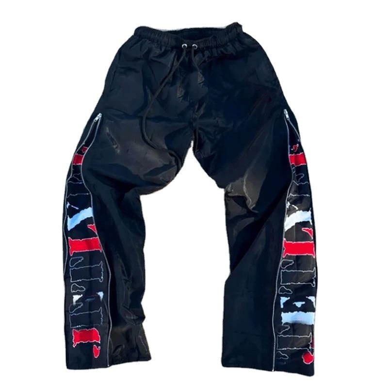 กางเกงวอร์มกันลมสะท้อนแสงสำหรับผู้ชายเสื้อผ้าแนวสตรีทผ้าไนลอนระบายอากาศได้ดีมีเชือกรูดขนาดกลางทรงโป่งพอง