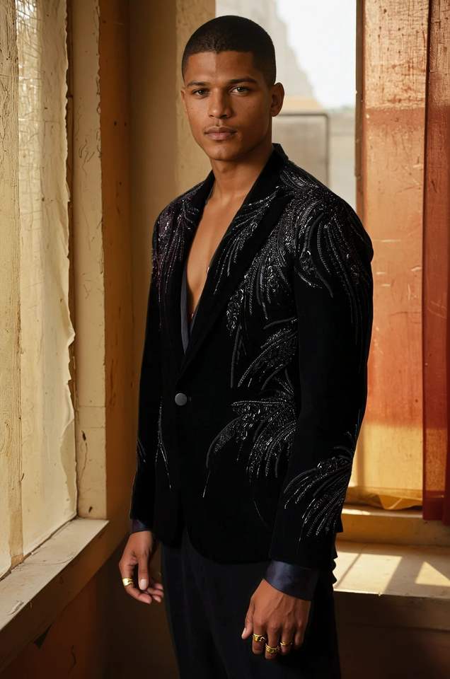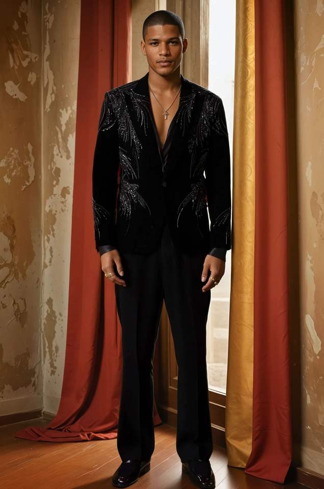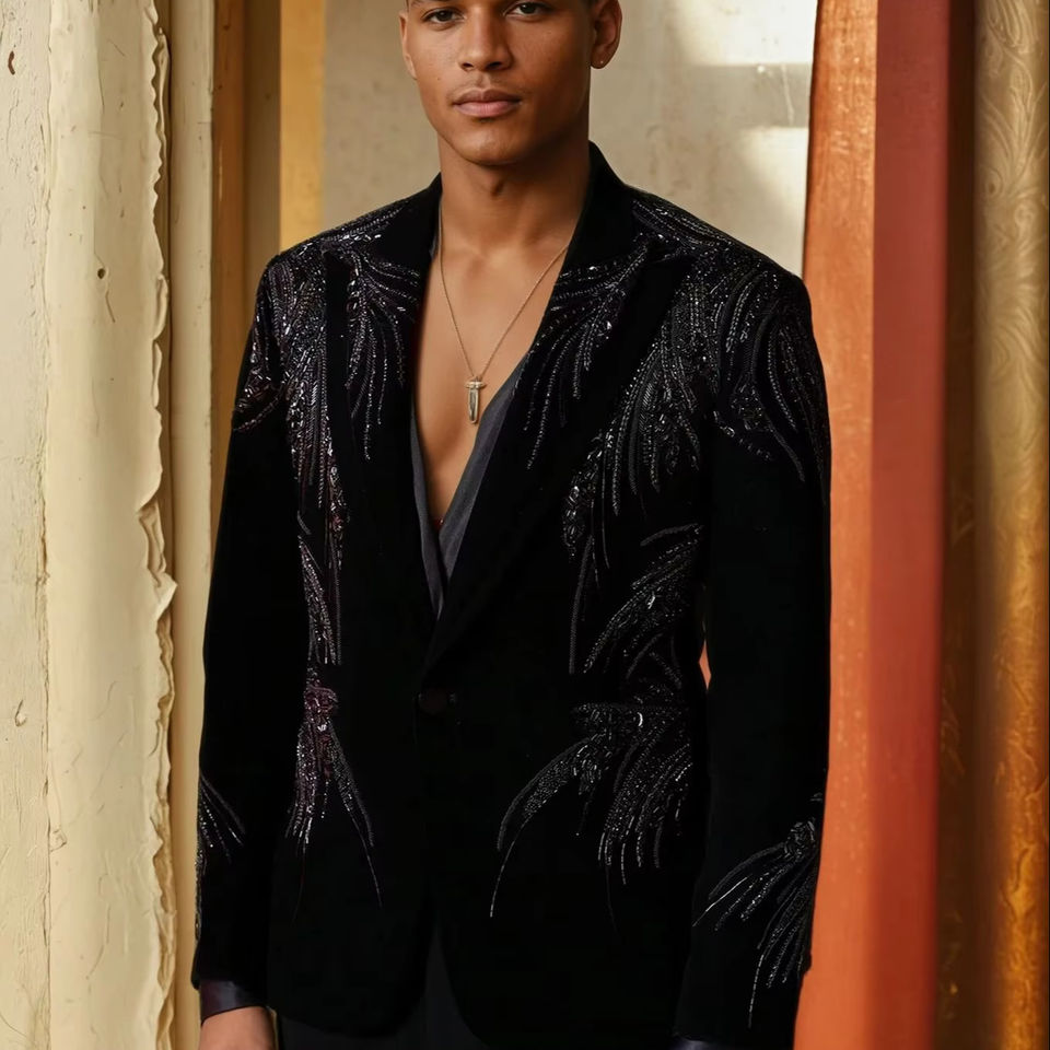 สูททางการสำหรับงานแต่งงานแนววินเทจของผู้ชายสูททรงสลิมฟิตปักสีทอง