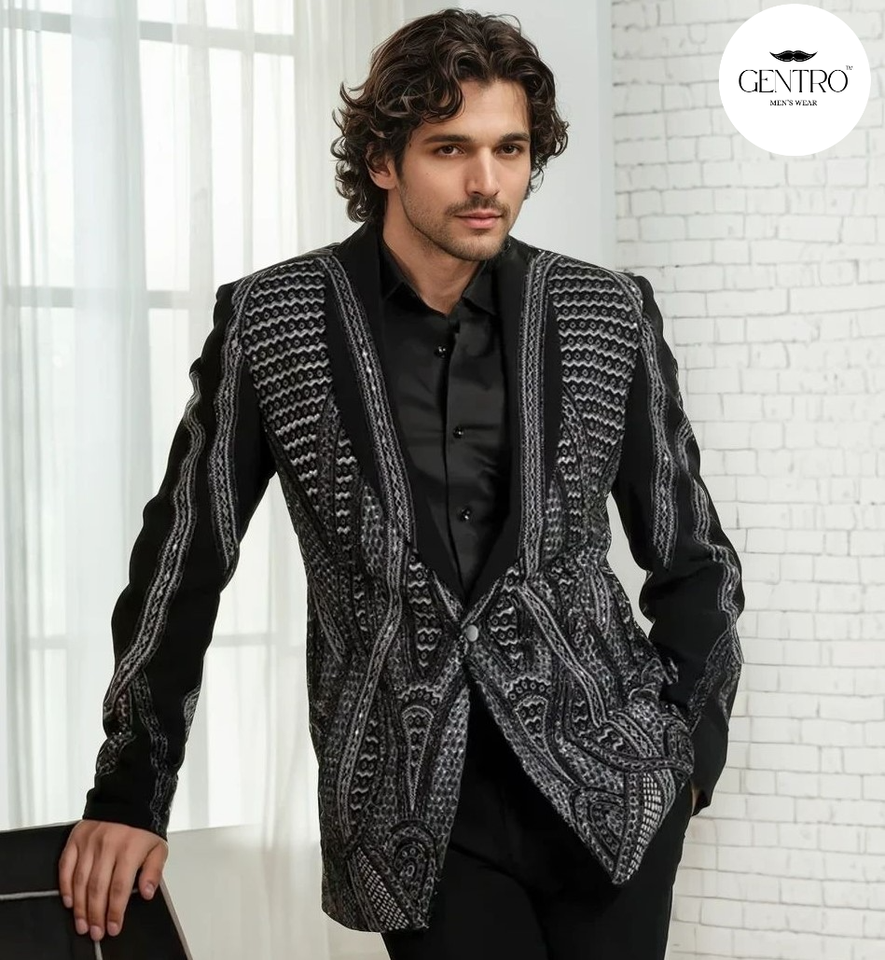 สูททางการสำหรับงานแต่งงานแนววินเทจของผู้ชายสูททรงสลิมฟิตปักสีทอง