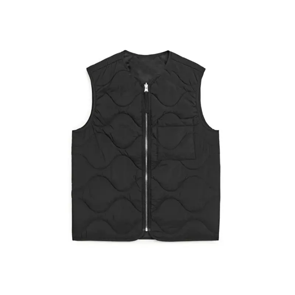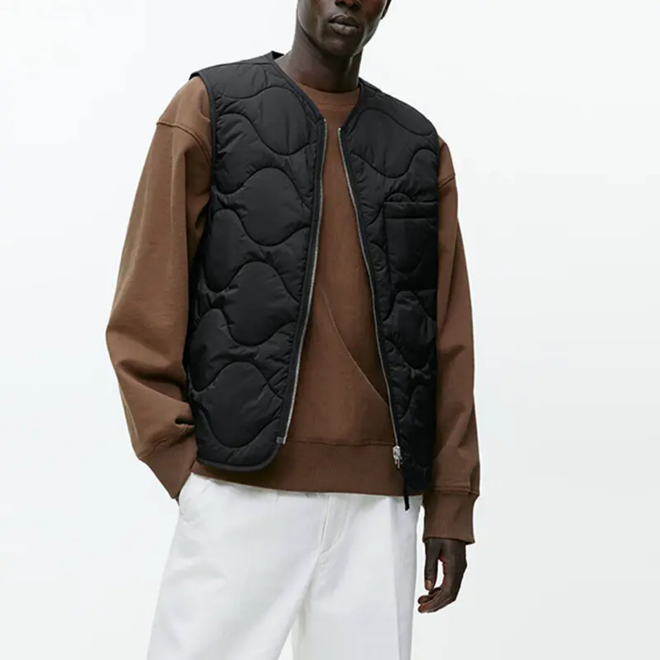เสื้อกั๊กผู้ชายสั่งตัดพิเศษสำหรับฤดูหนาวและฤดูใบไม้ร่วง คอตั้ง ซิป ดีไซน์เรียบง่าย สไตล์ไฮสตรีท บริการ OEM พร้อมโลโก้ด้านหน้า