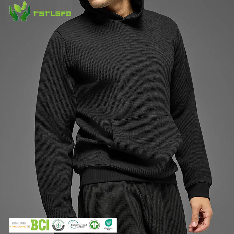 Men's Winter Custom Embroidered Waffle Texture Eco-Friendly Knit Performance Sweatshirt with Kangaroo Pocket