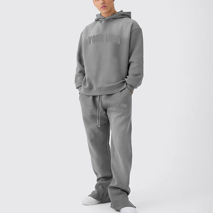 ชุดกีฬาผู้ชายแบบสั่งทำพิเศษ พิมพ์ลายสองชิ้น เสื้อฮู้ดสีเทาและกางเกงขายาวทรงตรงสำหรับออกกำลังกาย