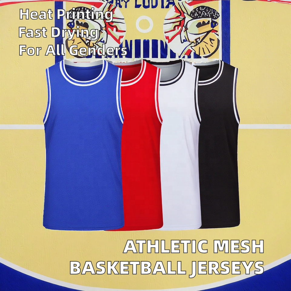 เสื้อบาสเก็ตบอลตาข่ายพิมพ์ชื่อทีมแบบกำหนดเองสำหรับผู้ชาย ผลิตจากโพลีเอสเตอร์ 100% แห้งเร็ว ไม่มีแขน เหมาะสำหรับเล่นกีฬาในฤดูร้อน