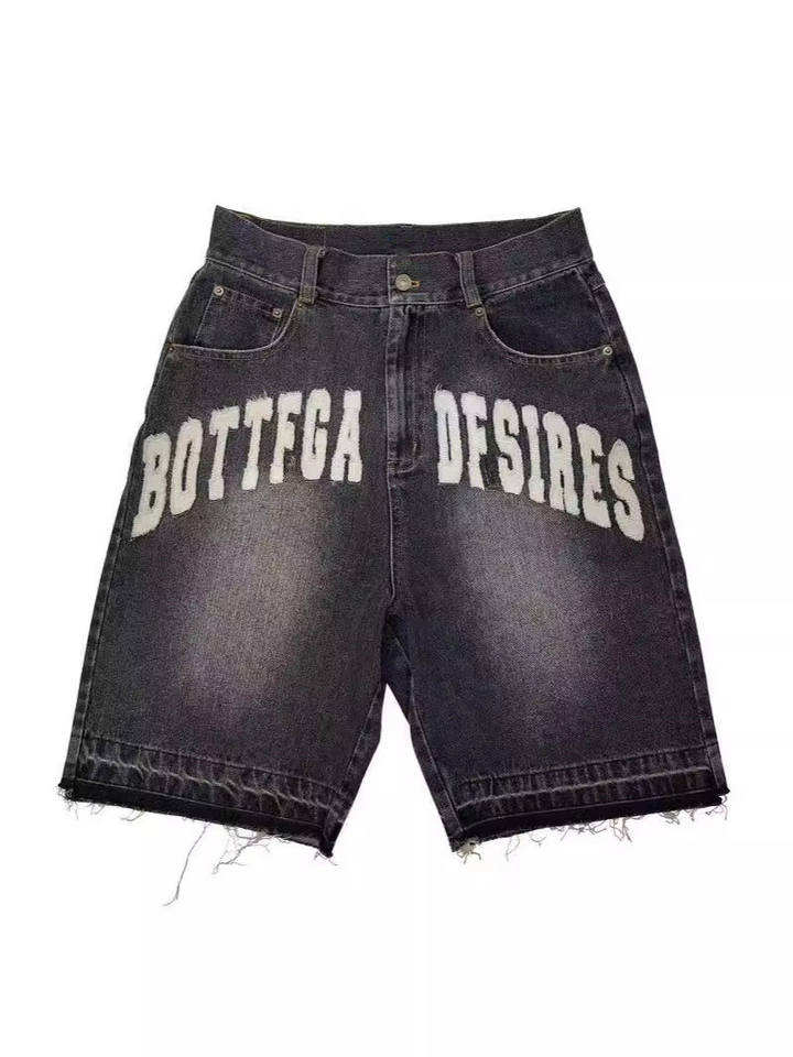 กางเกงยีนส์ขาสั้นผู้ชายสีเข้ม แต่งลายปัก ขอบดิบ ทรงหลวม สไตล์สตรีทแวร์ สำหรับฤดูร้อน