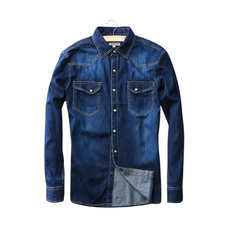เสื้อลำลองผ้ายีนส์สีน้ำเงินเข้มของผู้ชายเสื้อยีนส์แขนยาวน้ำหนักเบาสำหรับเครื่องแต่งกายที่มีสไตล์ในชีวิตประจำวัน