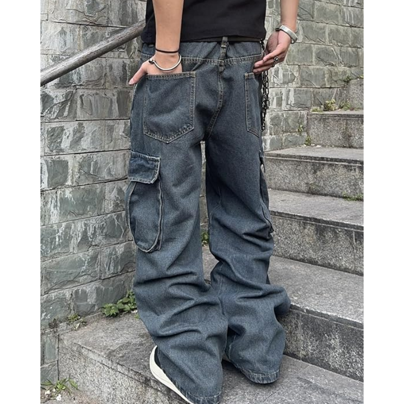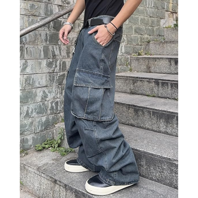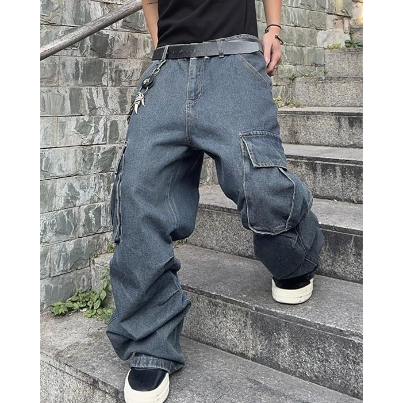 กางเกงยีนส์ทรงหลวมสำหรับผู้ชาย – กางเกงยีนส์ขากว้างน้ำหนักปานกลางพร้อมกระเป๋าคาร์โก้ กางเกงสตรีทแวร์ลำลองสไตล์ฮิปฮอปสำหรับนักสเก็ต