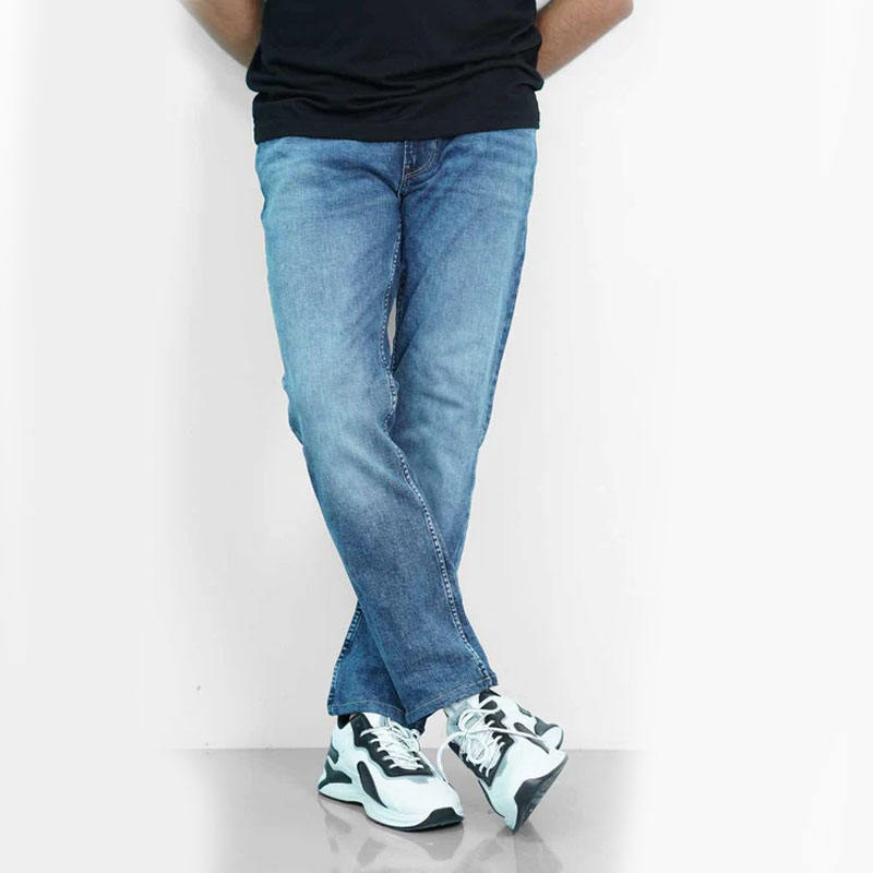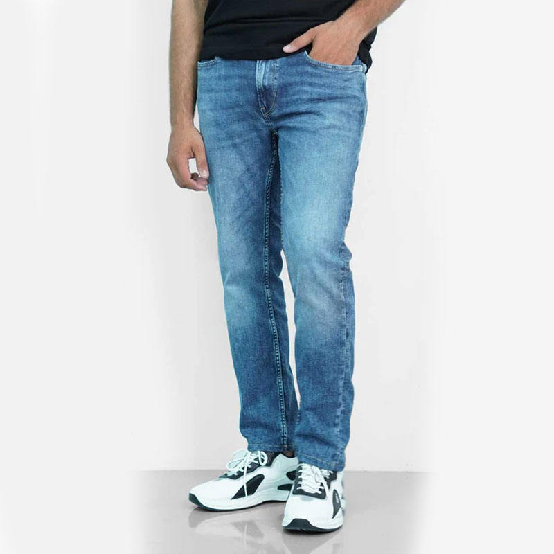 กางเกงยีนส์เดนิมผู้ชายทรงคลาสสิค ทรงตรง สีน้ำเงินฟอก ผ้าฝ้ายลำลอง สำหรับขายส่ง