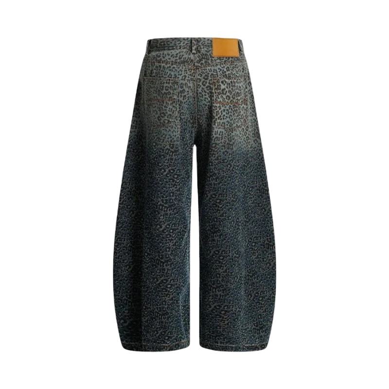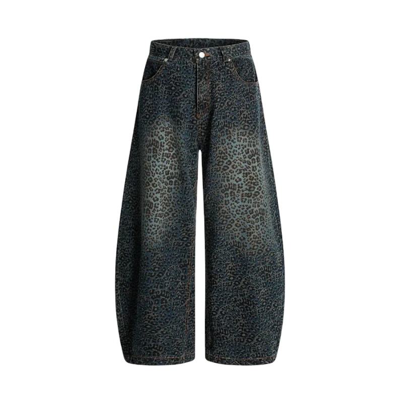 กางเกงยีนส์ทรงบาร์เรลพิมพ์ลายเสือดาว DTG สำหรับผู้ชาย สไตล์สตรีทลำลอง แต่งขาดๆ กระดุมติด ล้างสีแบบแอซิด เอวสูง ทรงขากว้าง สำหรับฤดูใบไม้ร่วง