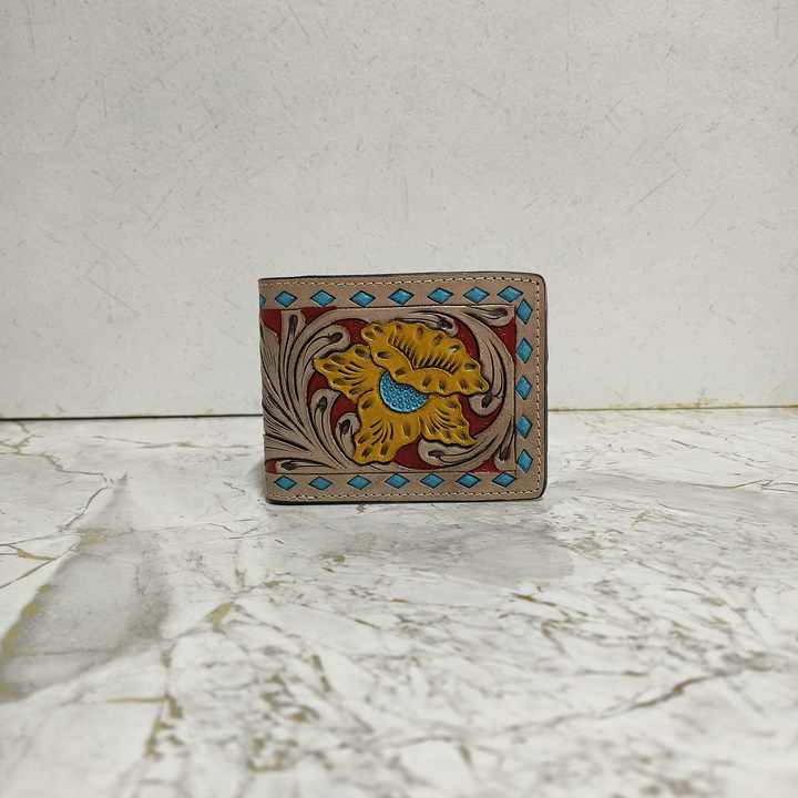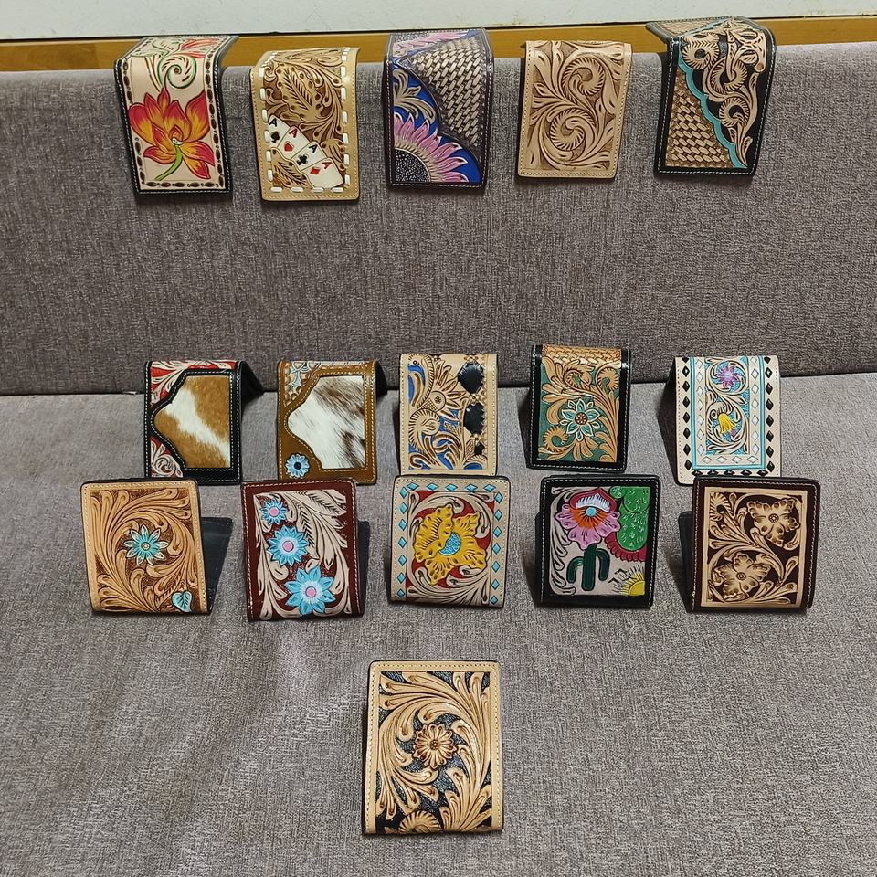 กระเป๋าสตางค์หนังวัวสีน้ำตาลวินเทจดีไซน์เนอร์สำหรับผู้ชายกระเป๋าสตางค์ใบสั้นกันขโมยลายดอกไม้มีซิปยาวที่ใส่เงินสด