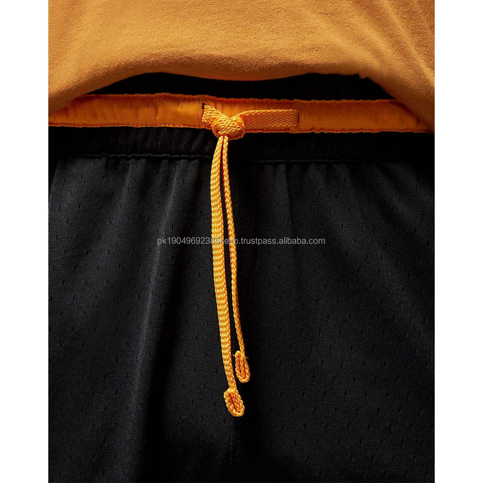 กางเกงขาสั้นติดเพชรสำหรับผู้ชาย100% ตาข่ายโพลีเอสเตอร์สีดำ & สีส้มสีพื้นมีสายรัดเอวยางยืดและเทปถักลายทาง