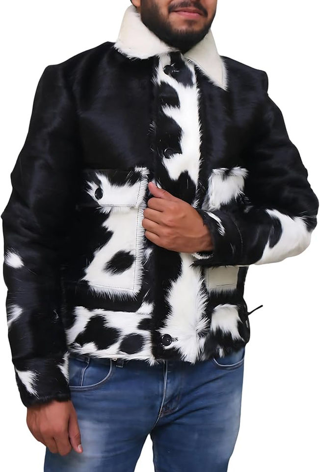 แจ็กเก็ตหนังวัวสำหรับผู้ชาย, พร้อมปกตั้งโลโก้ด้านหน้าลายพื้น