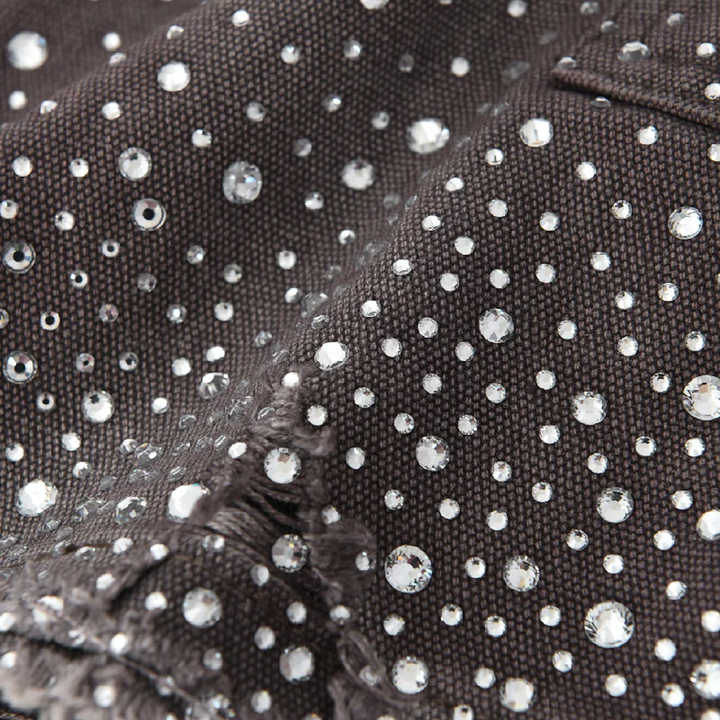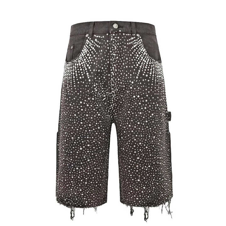 กางเกงยีนส์ขาสั้นผู้ชายสไตล์วินเทจ แต่งลายเพชร ทรงหลวม ล้างสีแบบแอซิด ขอบดิบ ประดับคริสตัลทั้งตัว ผ้าแคนวาสผสมผ้าฝ้าย