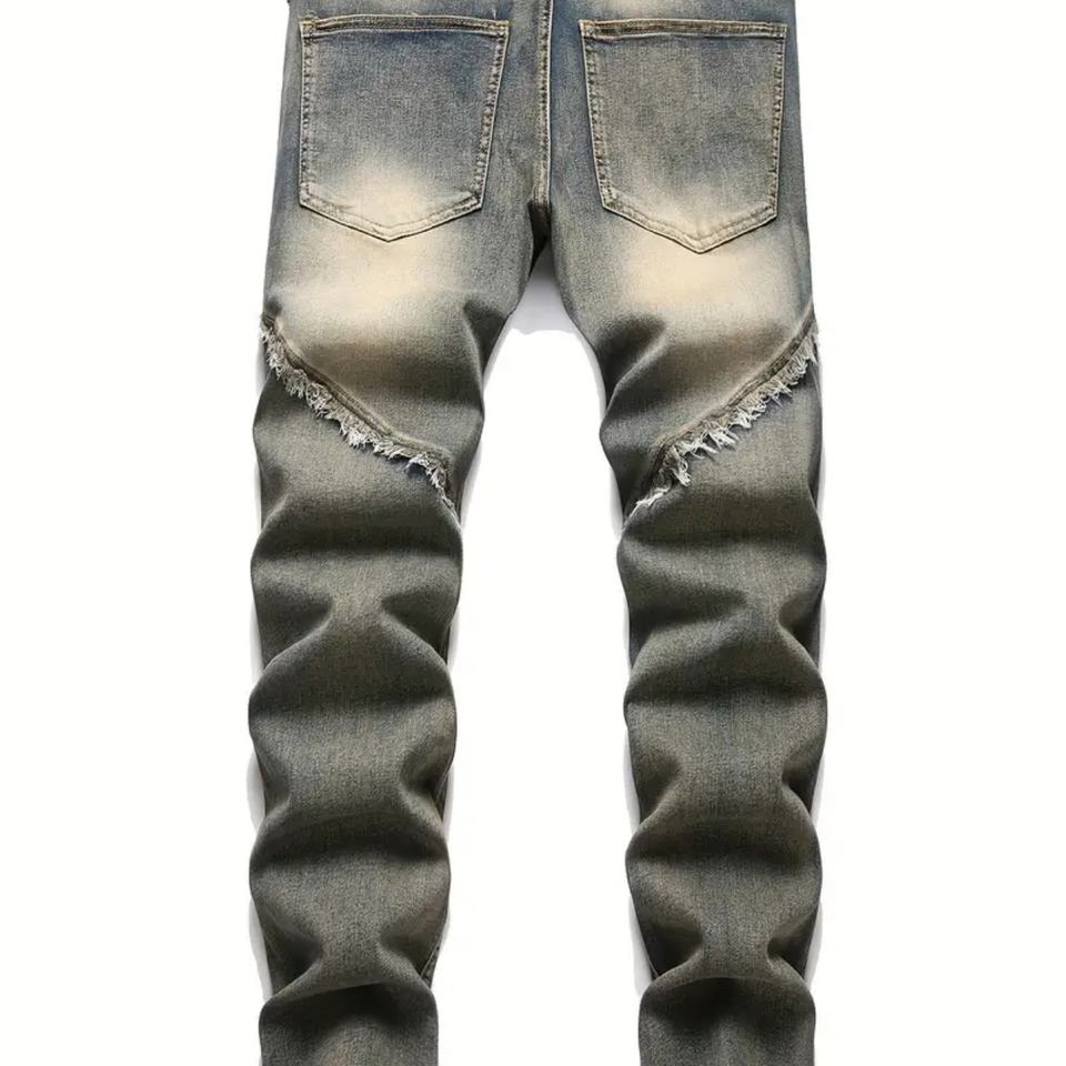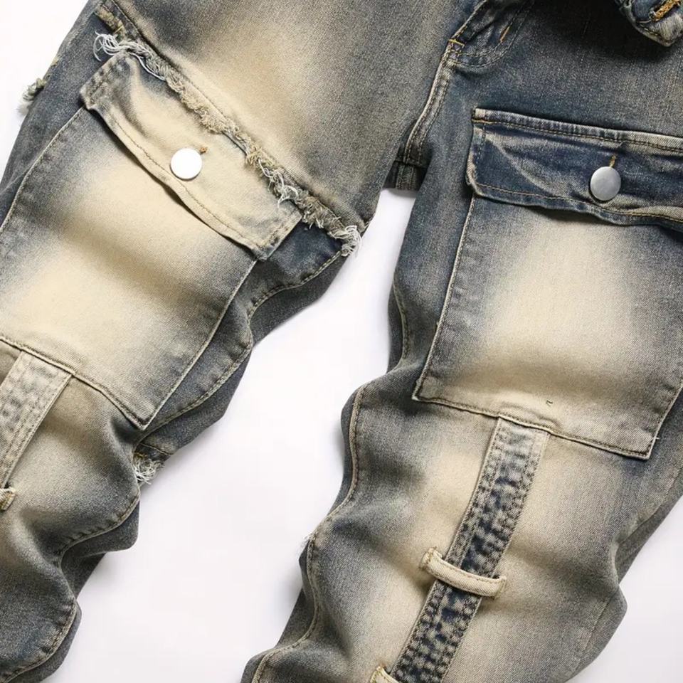 กางเกงยีนส์ผู้ชายสไตล์ดิสเทรส, กางเกงคาร์โก้ Y2K พร้อมสายรัดเข่าและกระเป๋าหลายช่อง, แฟชั่นสตรีทแวร์ฮิปฮอป, เอฟเฟกต์ย้อมสีเหลืองแบบแอซิดวอช