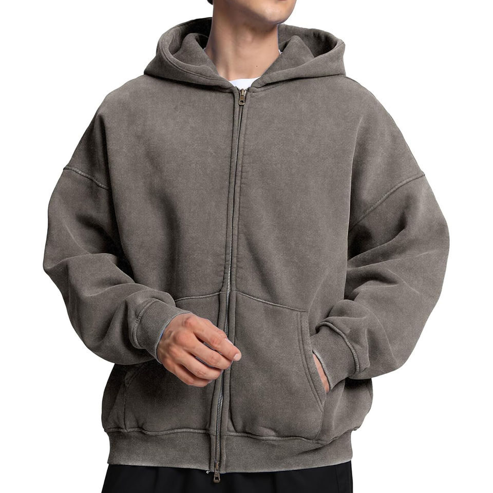 เสื้อฮู้ดดี้ผู้ชายทรงหลวมแบบมีซิป ผ้าฝ้ายเฟรนช์เทอร์รี่ 100% ซักย้อมสีแบบแอซิดวอช เนื้อผ้าหนา ไม่หดตัว ทรงบ็อกซี่ แบบครอป