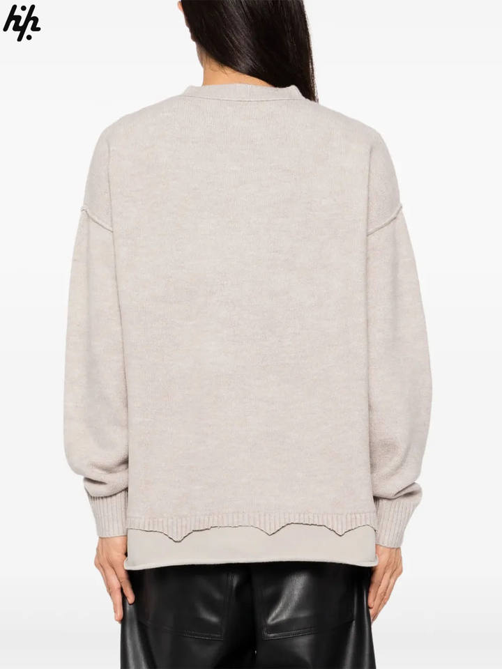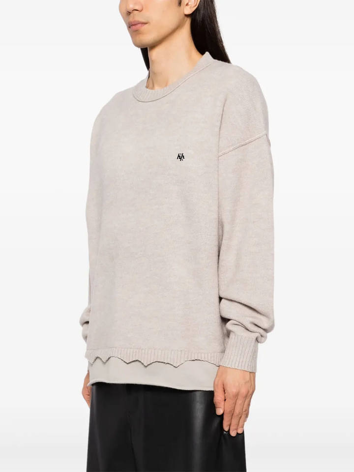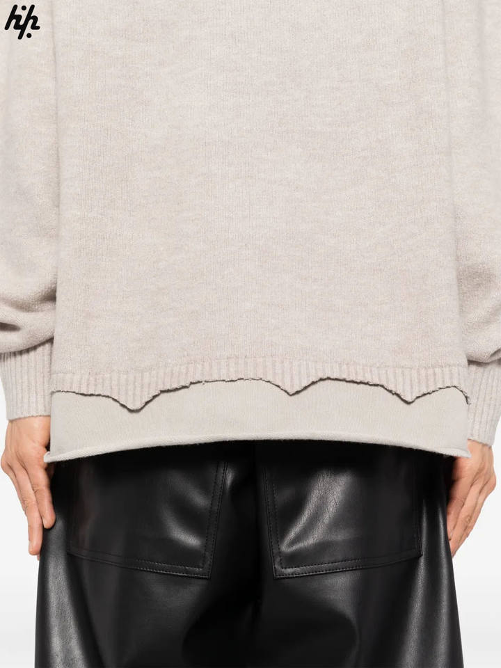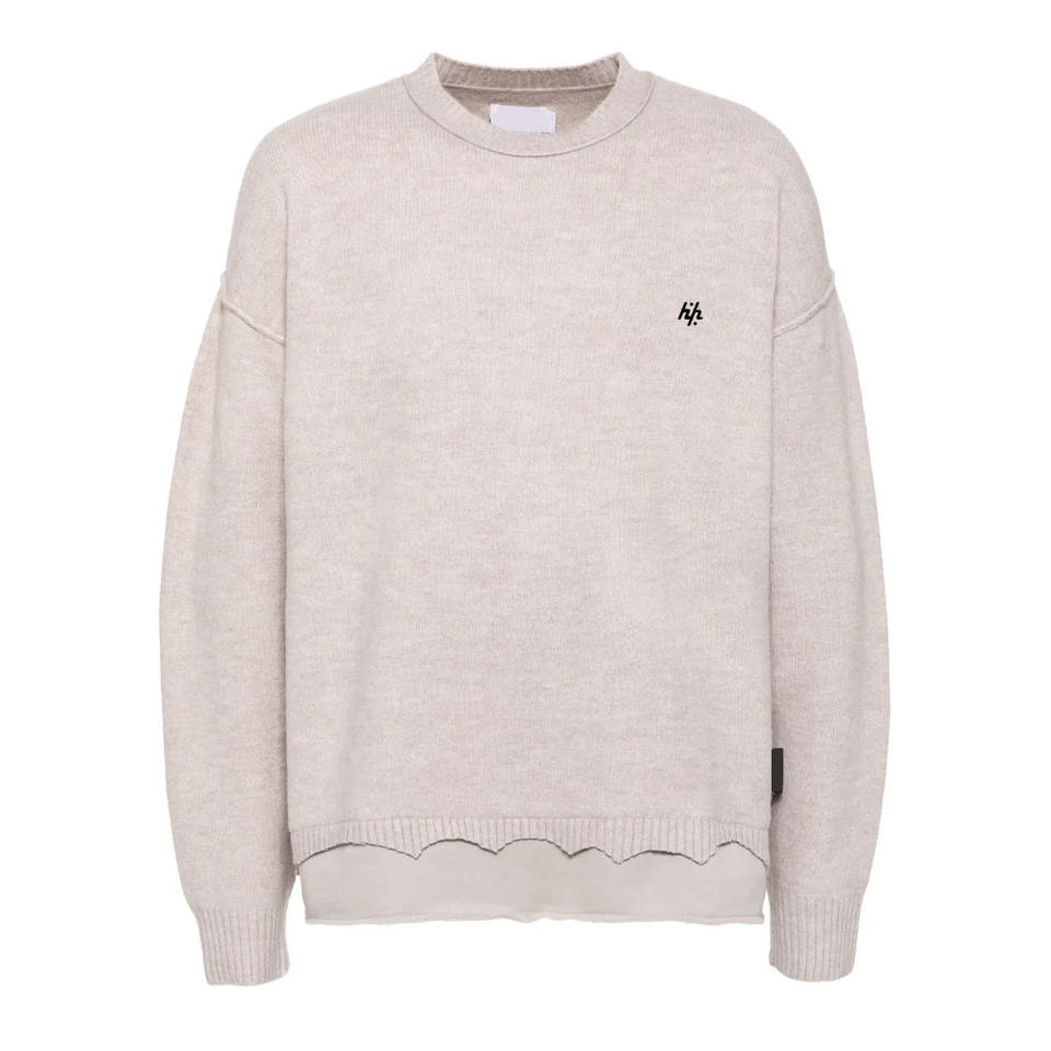Men's Elegant Beige Knit Crewneck Sweatshirt with Feminine Scallop Hem Subtle Black Embroidered Emblem Long Sleeves for Winter
