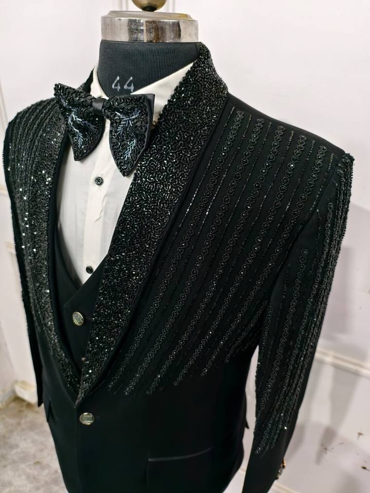 สูทสามชิ้นสีดำสุดหรูของผู้ชายออกแบบมาเพื่องานแต่งงานและงานทางการสไตล์คลาสสิกเหนือกาลเวลาขนาดใหญ่พิเศษ
