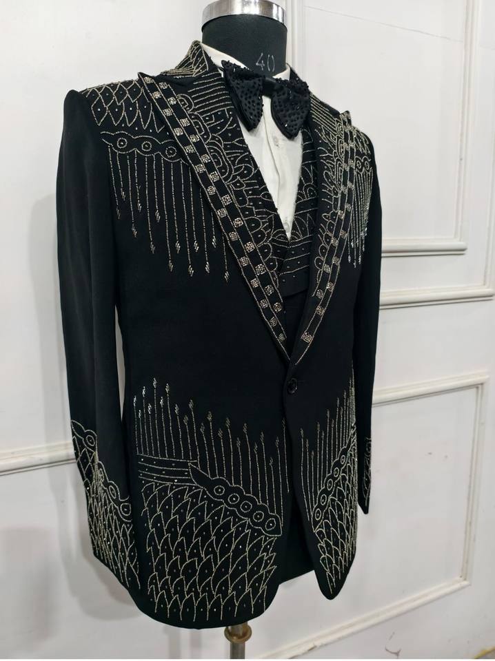 สูทสามชิ้นสีดำสุดหรูของผู้ชายออกแบบมาเพื่องานแต่งงานและงานทางการสไตล์คลาสสิกเหนือกาลเวลาขนาดใหญ่พิเศษ