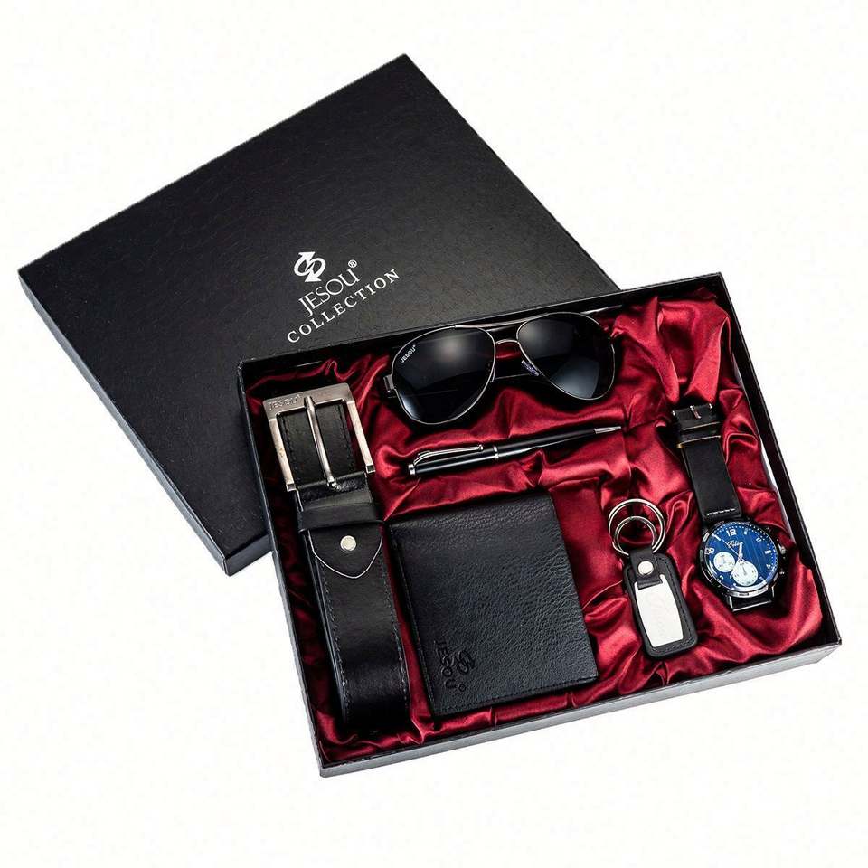 ชุดของขวัญสุดหรูสำหรับผู้ชาย 7 ชิ้น ประกอบด้วยนาฬิกาควอตซ์ กระเป๋าสตางค์ น้ำหอม กล่องใส่ของ กล่องใส่เข็มขัด หัวเข็มขัด (ไม่มีของแถม)