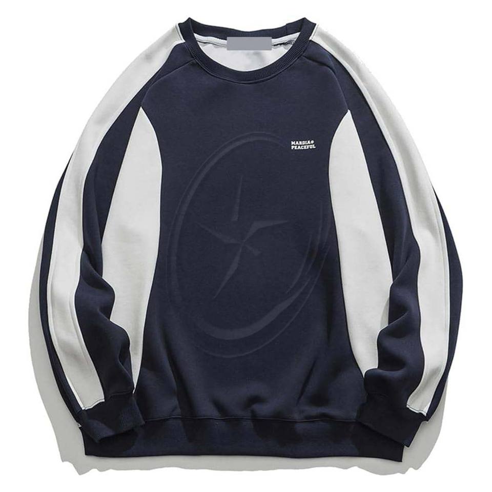 เสื้อสเวตเตอร์แฟชั่นผู้ชายลายกราฟิกปะต่อคอกลมเสื้อสเวตเชิ้ตโอเวอร์ไซซ์แนวสตรีทใส่ลำลองมีเชือกรูดสไตล์เกาหลี