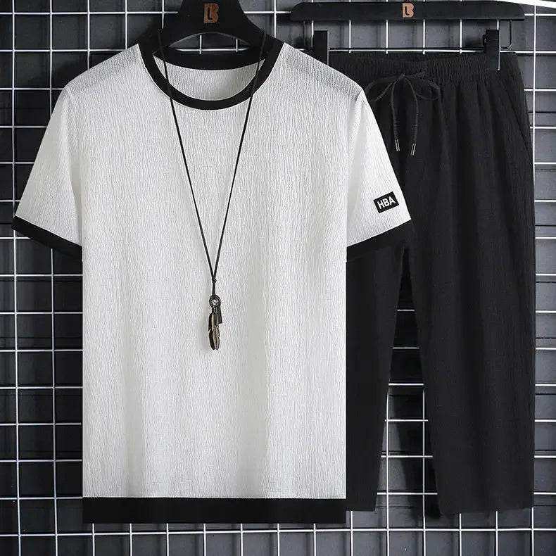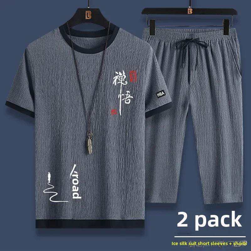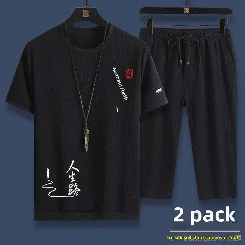 Men's Fashionable Summer Casual Sports Outfit Two-Piece Set Ice Silk Short Sleeve T-Shirt Shorts Solid Print Pattern Knitted