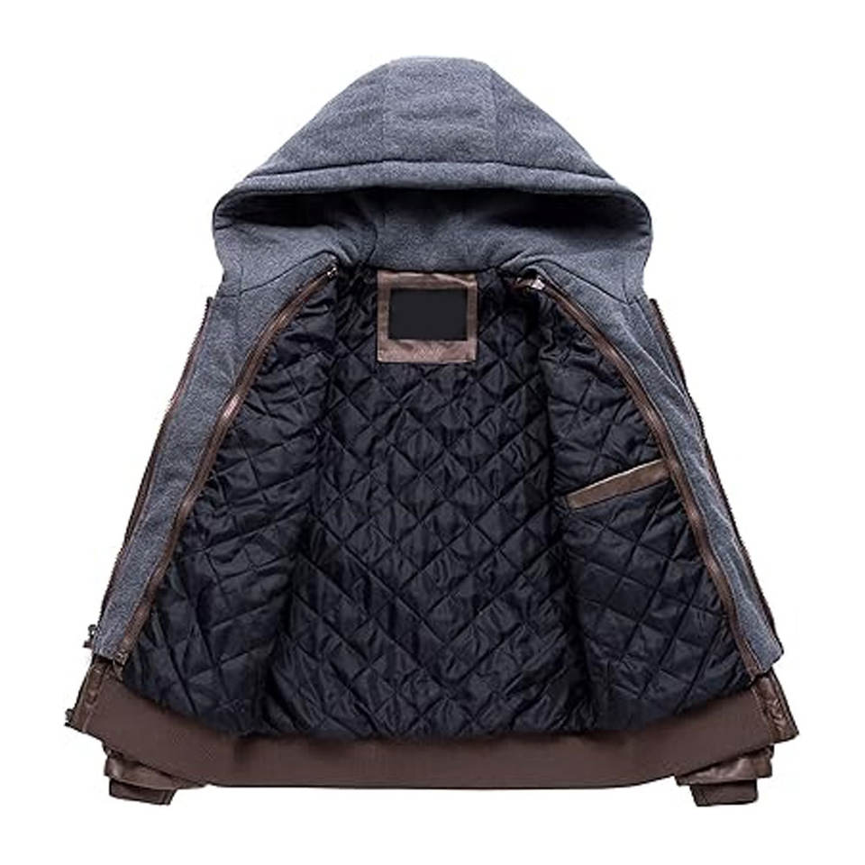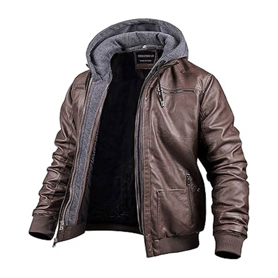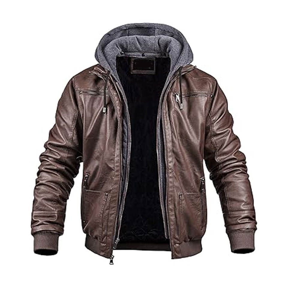 เสื้อแจ็คเก็ตมอเตอร์ไซค์หนังเทียมสำหรับผู้ชาย ฮู้ดถอดได้ กันน้ำ กันลม แจ็คเก็ตบอมเบอร์ PU สไตล์วินเทจ เสื้อนอกมีซิปและกระเป๋า