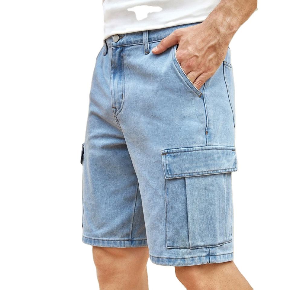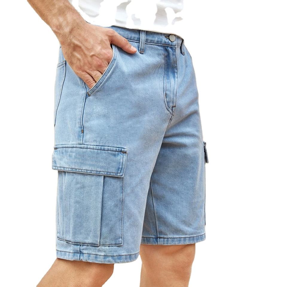 กางเกงขาสั้นเดนิมคาร์โก้ผู้ชาย สไตล์ลำลองและฟิตเนส มีซิปผ่าหน้า พร้อมเชือกผูกเอวและกระเป๋าหลายช่อง สไตล์สตรีทแวร์ กางเกงกีฬา