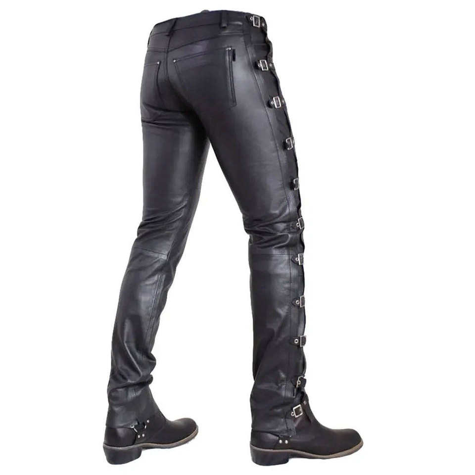 กางเกงหนังวัวแท้สำหรับผู้ชาย ดีไซน์กระดุมผ่าหน้า พร้อมลายปัก ขายส่งแบบ OEM