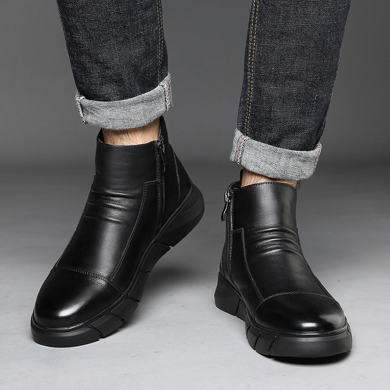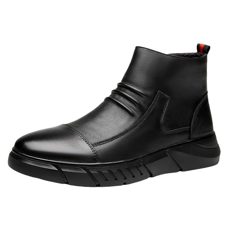 รองเท้าบูทข้อเท้าหนังแท้สำหรับผู้ชาย สไตล์เรโทร ลำลอง ใส่ทำงาน กันน้ำ กันลื่น สวมแบบสลิปออน บุผ้าฝ้ายอุ่น สำหรับฤดูใบไม้ร่วง/ฤดูหนาว