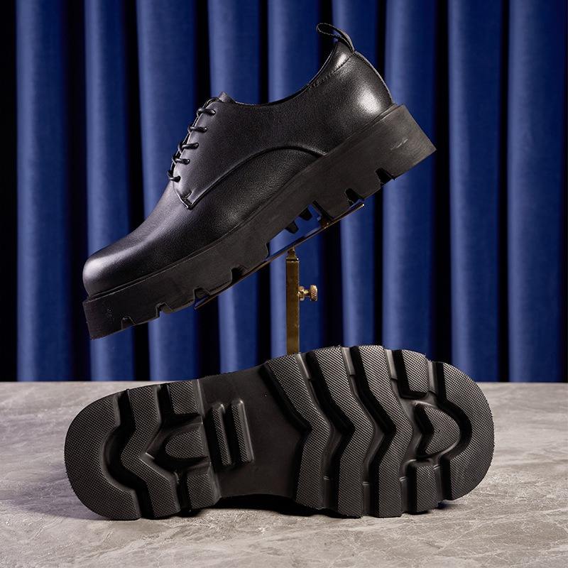รองเท้าดาร์บี้หนังแท้สีดำสำหรับผู้ชาย, รองเท้าลำลองสไตล์อังกฤษเปิดนิ้วเท้ากว้างส้นหนา