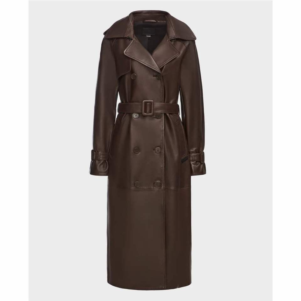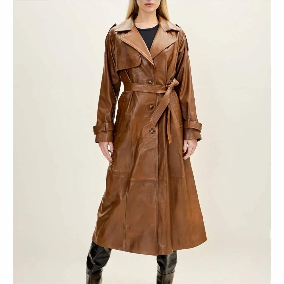 เสื้อโค้ทหนังแท้สำหรับผู้ชาย - เสื้อโค้ทหนังวัวแท้เกรดพรีเมียมแบบยาว พร้อมเข็มขัด ปกเสื้อแบบสูท