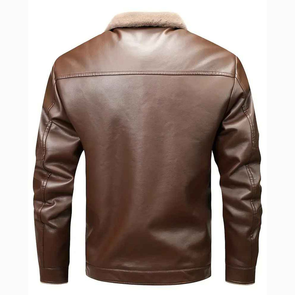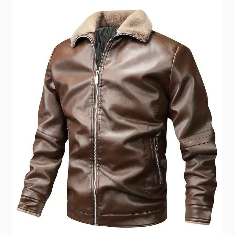 แจ็กเก็ตขี่มอเตอร์ไซค์หนังแท้สำหรับผู้ชายคอเสื้อลูกเรือคอปกเสื้อลำลองขนแกะสำหรับฤดูหนาวสีน้ำตาลเสื้อผ้าแบบพรีเมียม