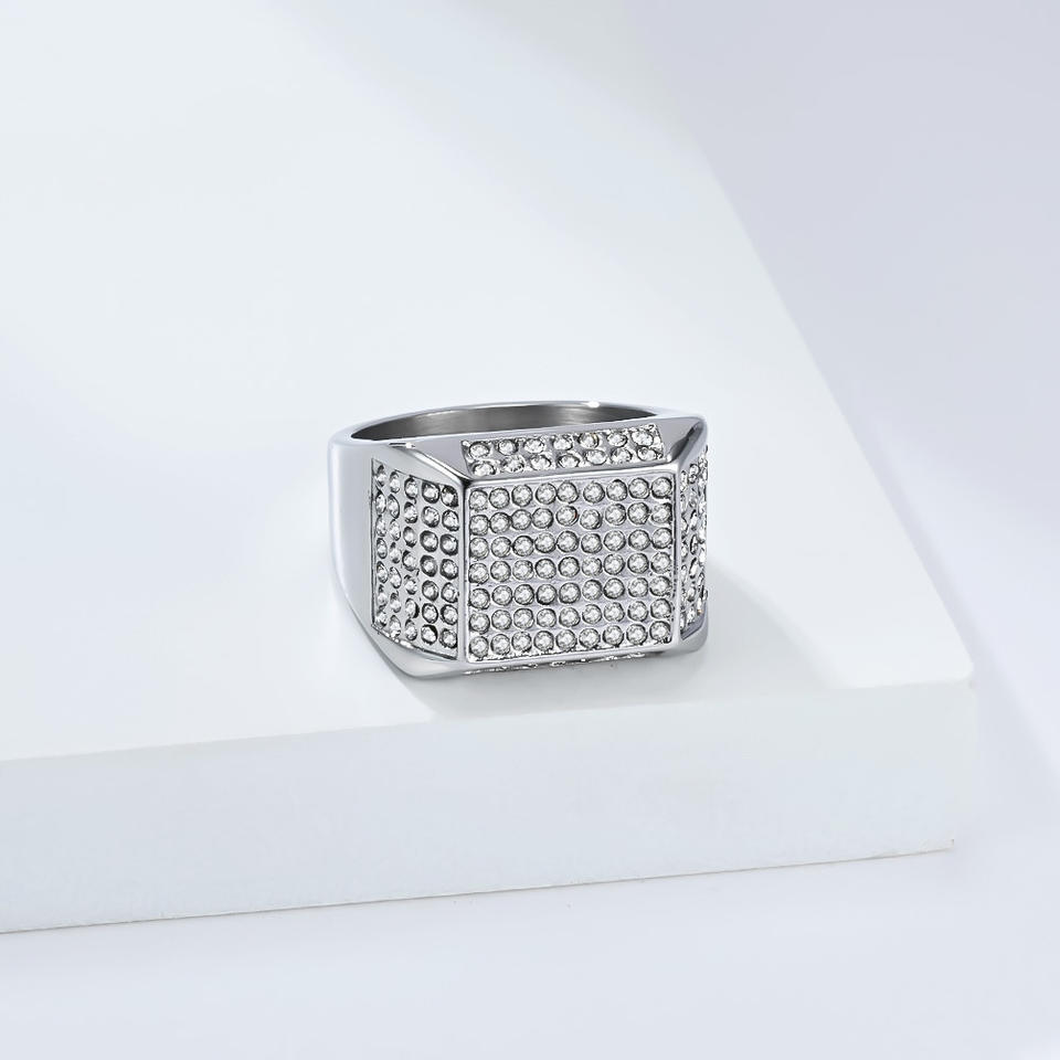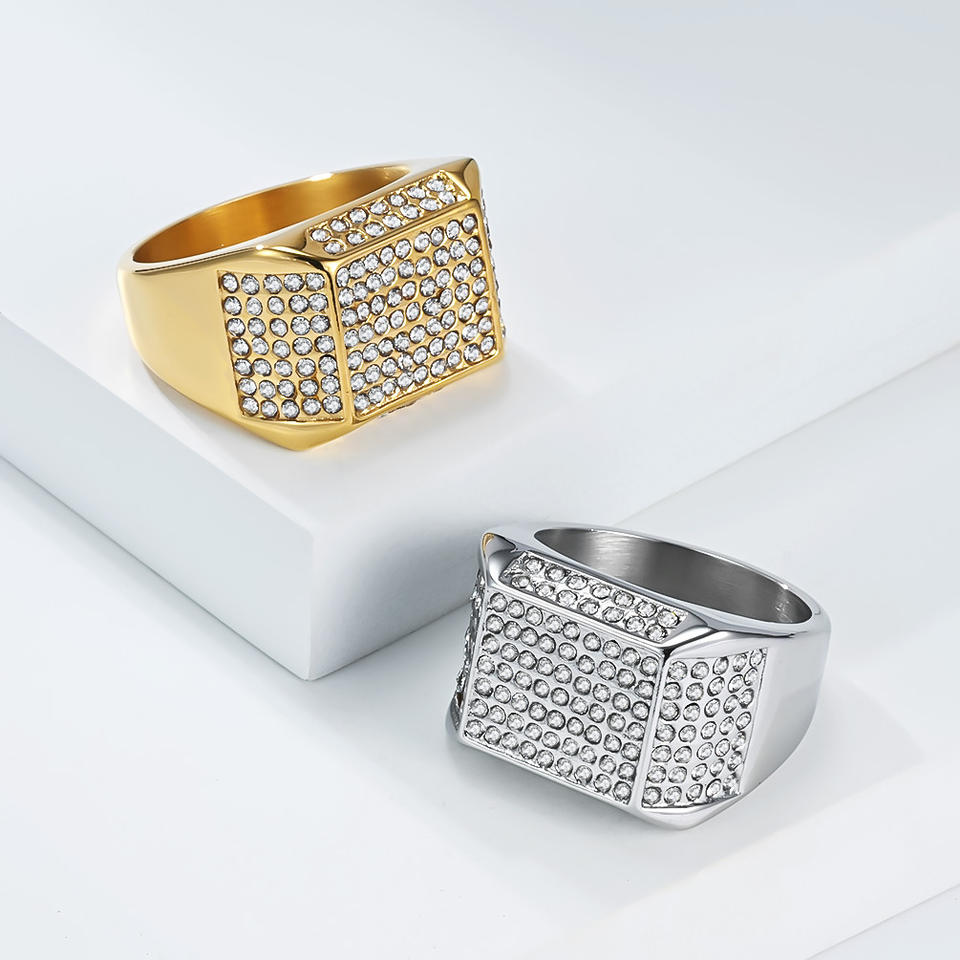แหวนฮิปฮอปทรงเรขาคณิตสำหรับผู้ชาย ชุบทอง 18K ไทเทเนียมสตีล ประดับเพชรไมโครเพฟ เครื่องประดับสำหรับงานปาร์ตี้