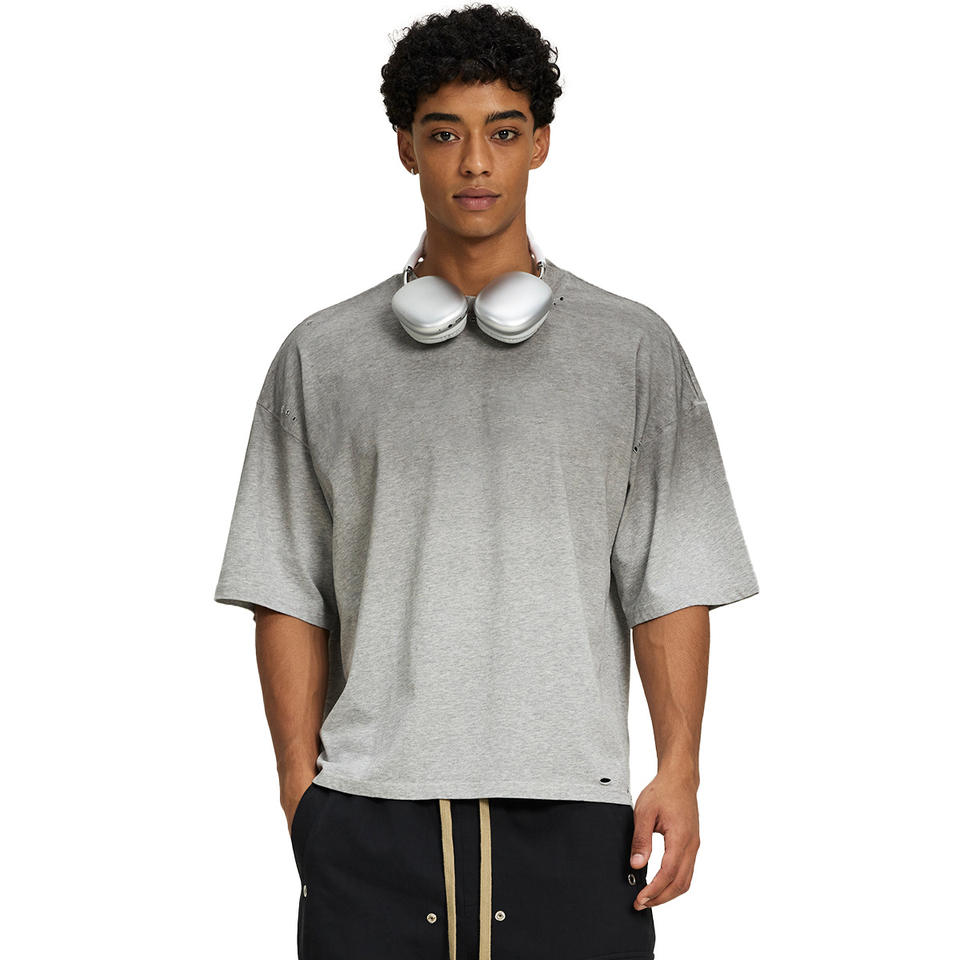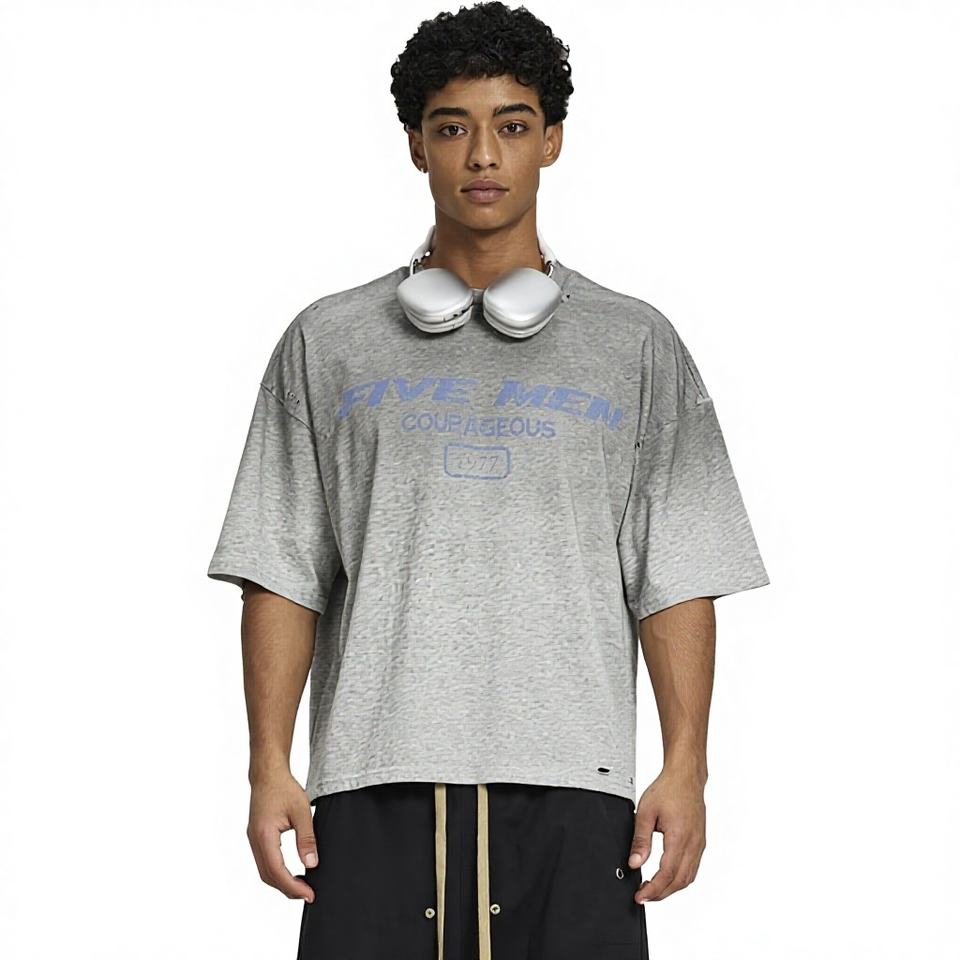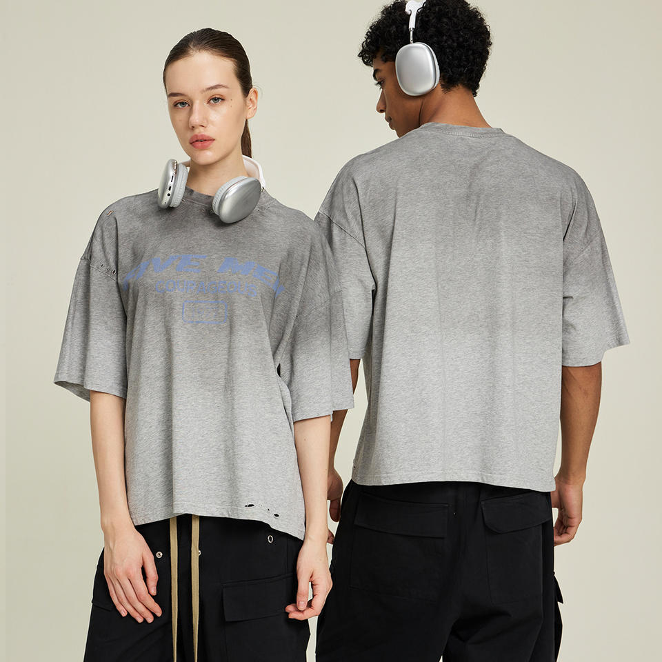 เสื้อยืดผู้ชาย แขนสั้น ทรงหลวม สไตล์สตรีท ลายดอกไม้ไล่เฉดสีเทา ผ้าฝ้าย 270 กรัม คุณภาพสูง ลายตัวอักษร ดีไซน์ทำเก่า ดูมีสไตล์