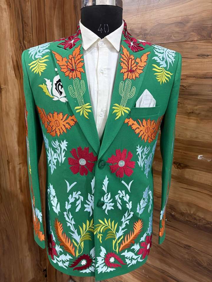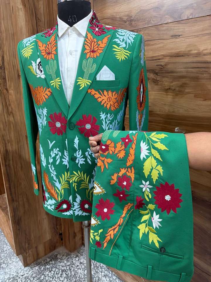 ชุดสูทตะวันตกปักลายสีเขียวสำหรับผู้ชาย ชุด 2 ชิ้น – เสื้อเบลเซอร์ลายดอกไม้พร้อมกางเกงเข้าชุด ชุดแต่งงานและชุดแสดงบนเวทีแบบสั่งตัด