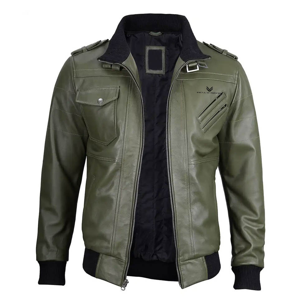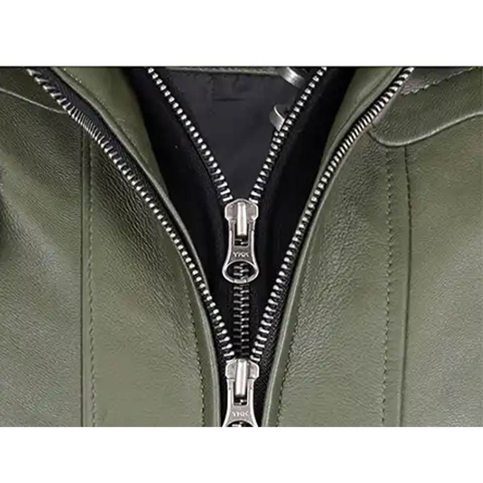 เสื้อแจ็คเก็ตหนังสีเขียวสำหรับผู้ชาย สไตล์นักบิน ทรงเข้ารูป ซิปหน้า