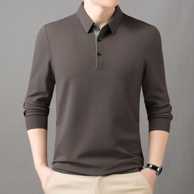 เสื้อโปโลแขนยาวสีเทาสำหรับผู้ชาย สไตล์ลำลองธุรกิจ ผ้าถัก คอปก แบบสวม สีพื้น สำหรับฤดูใบไม้ผลิและฤดูใบไม้ร่วง
