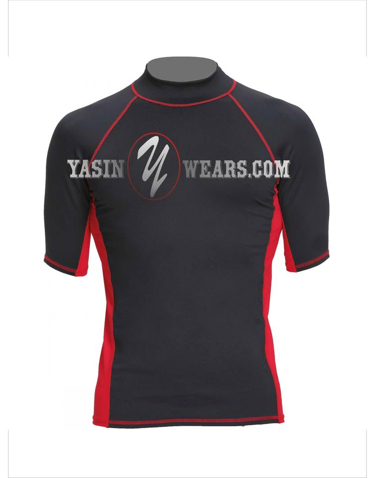 ผู้ชายครึ่งแขน Rush Guard ยืดฟิตเนสแห้งเร็วแขนสั้นผื่นยามว่ายน้ําสวมผื่นยามสีดําแขน Sublimated