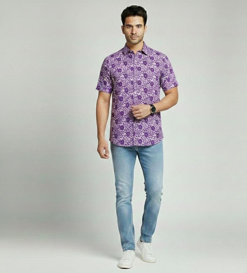 เสื้อเชิ้ตผู้ชายลายบาติกพิมพ์ลายด้วยมือ ผ้าฝ้าย 100% แขนครึ่งตัว ระบายอากาศได้ดี เป็นมิตรกับสิ่งแวดล้อม เหมาะสำหรับใส่ลำลองหรือเป็นทางการในฤดูร้อน