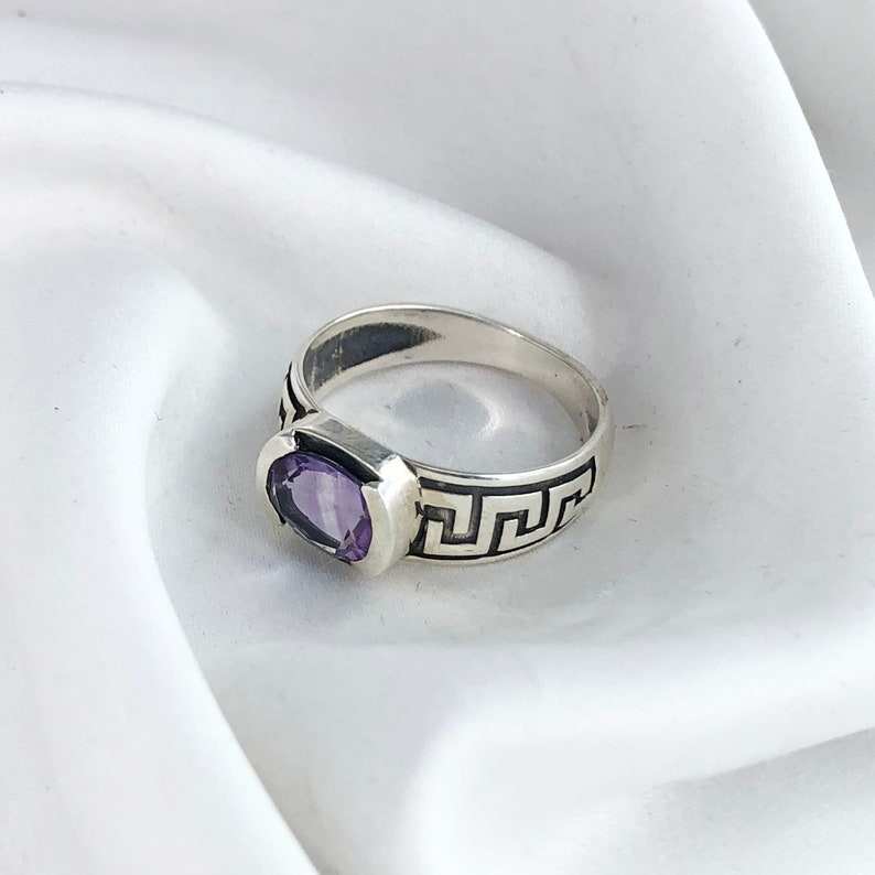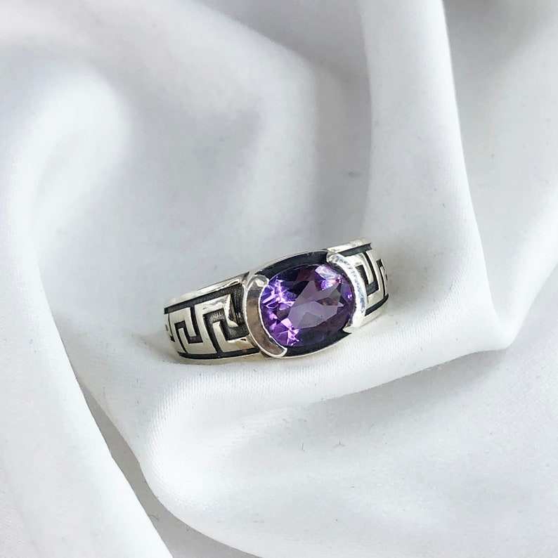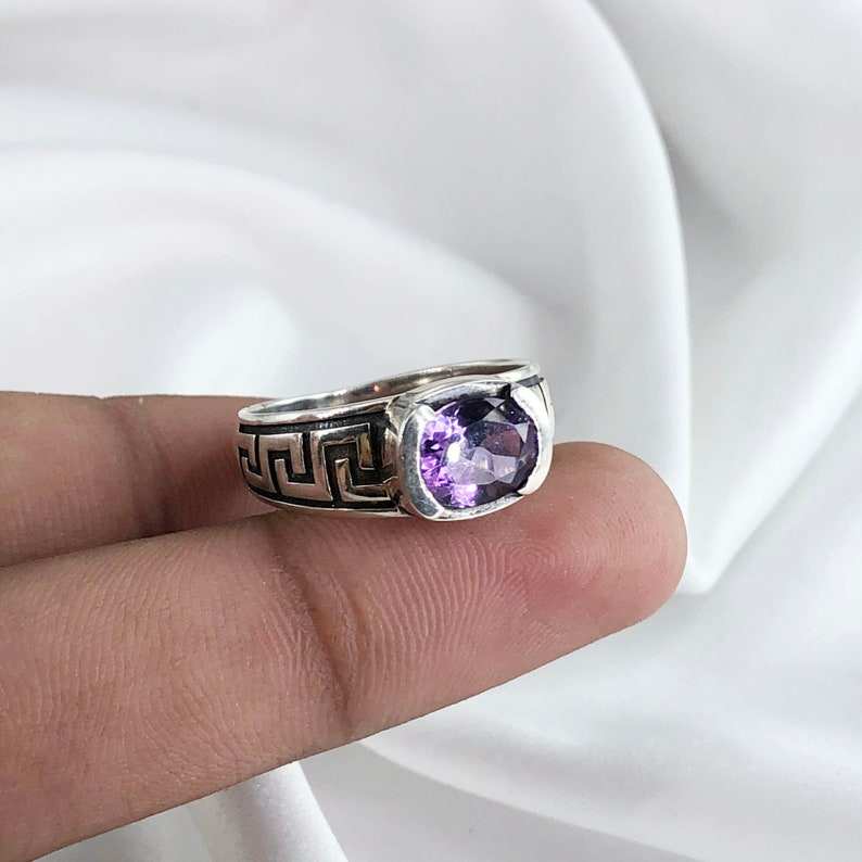 แหวน925เงินสเตอร์ลิงทำด้วยมือของผู้ชายประดับด้วยเพชรอเมทิสต์สีม่วงและไข่มุกมรดกสืบทอดงานแต่งสำหรับงานปาร์ตี้