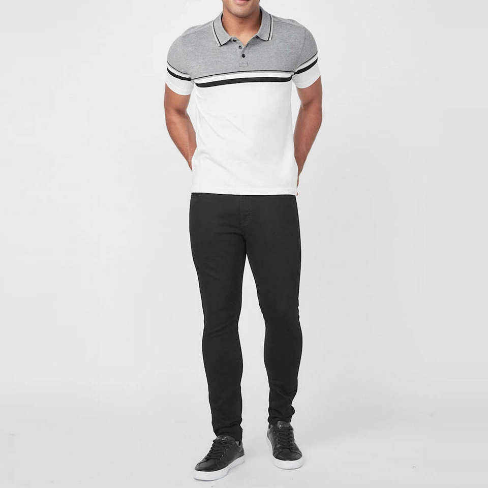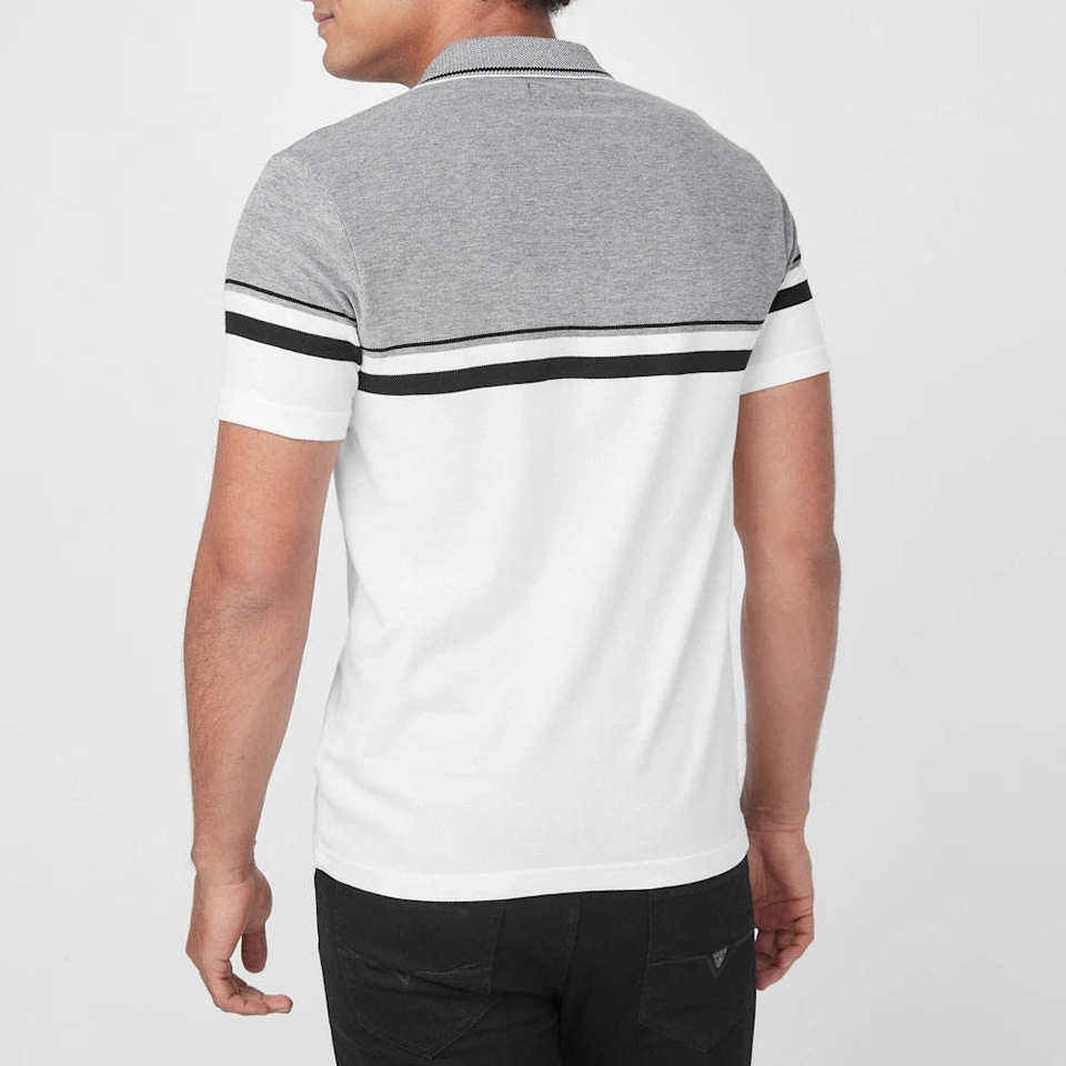 เสื้อโปโลชายสีเทาเฮเธอร์และสีขาวลายสามแถบ รุ่น 2026 สไตล์สมาร์ทแคชชวล แขนสั้น ทรงเข้ารูป ปกเสื้อแบบมีปลาย ชุดกีฬา