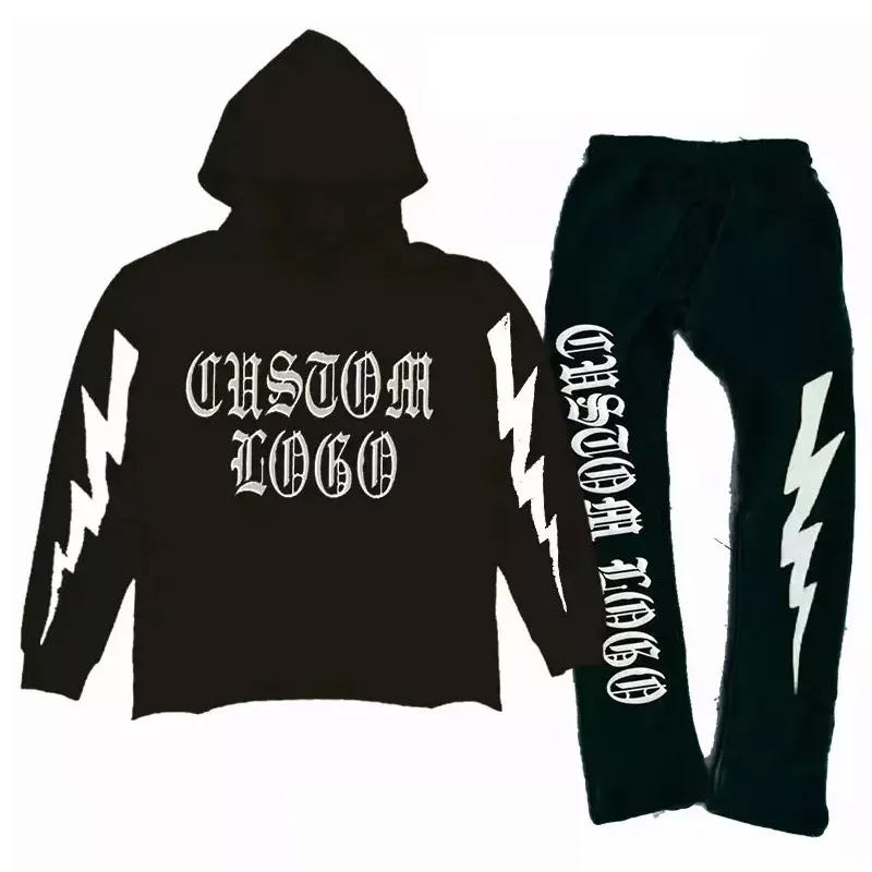 Men's Heavyweight Cotton Oversized Winter Tracksuit Sweatsuit Set Custom Crop Hood with Stacked Sweatpants Printed Jogger