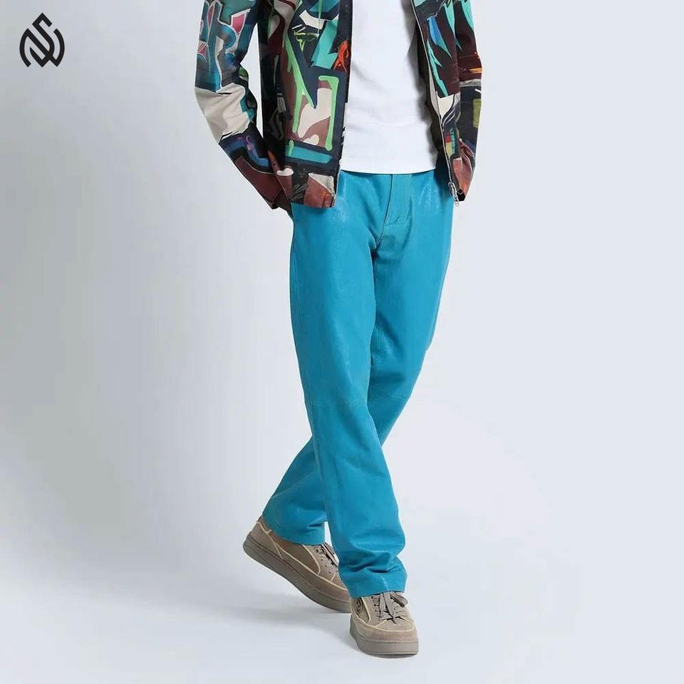 กางเกงหนังเอวสูงตรงสำหรับผู้ชายกางเกงสไตล์ใหม่ผ้าคุณภาพสูงสไตล์สตรีทสวมใส่ง่าย